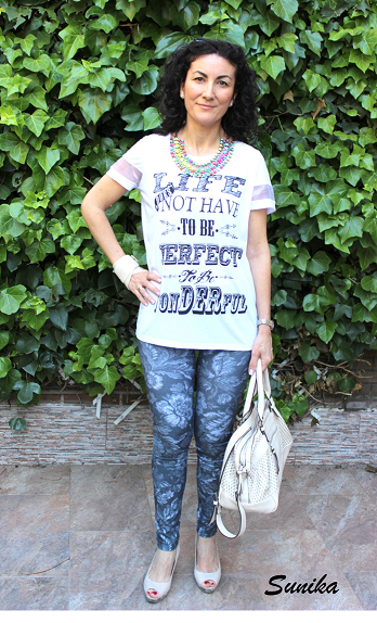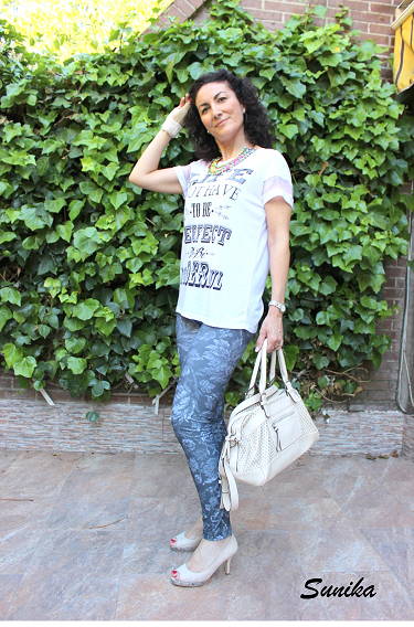 La férula de la mano derecha no es un accesorio, jejeje, por suerte gracias a ella mi tendinitis va mucho mejor. Como podéis ver es un look muy cómodo, unos leggins y una camiseta que combinados con unos tacones en un tono nude le dan un toque algo mas formal. La camiseta tiene un detalle trasparente en la mangas que la hace si cabe más especial.