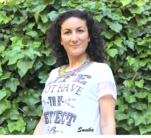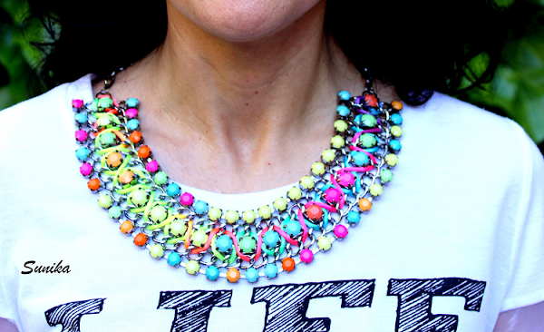 Esta camiseta me encanta, no solo porque últimamente me decanto por este tipo de camisetas con mensajes sino porque me encanta la frase con la que estoy totalmente de acuerdo. Como complemento incluí un collar que me enamoró nada mas verlo, es un collar de tipo babero multicolor. ¿No os parece super alegre? A mi me gusta muchísimo.