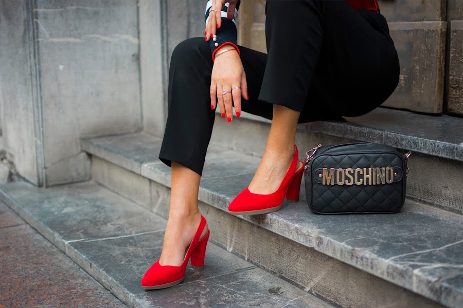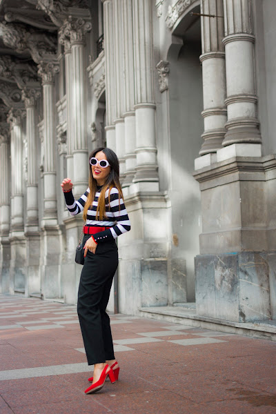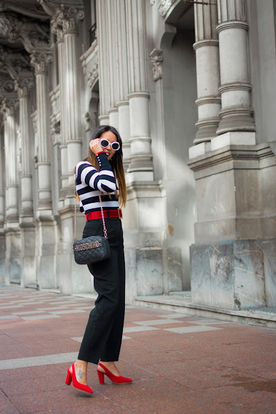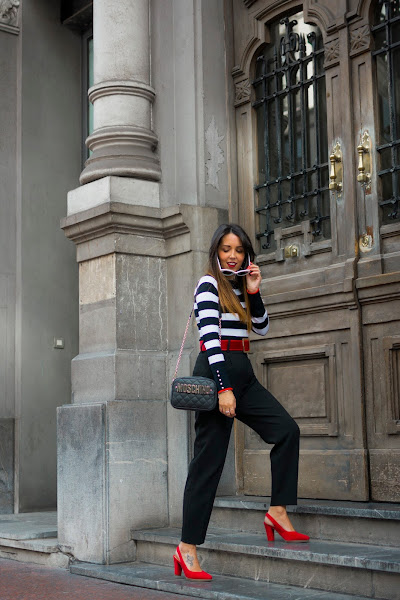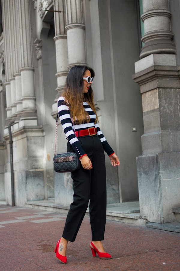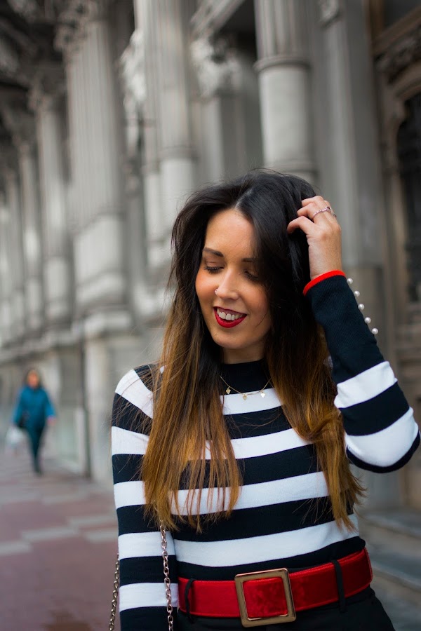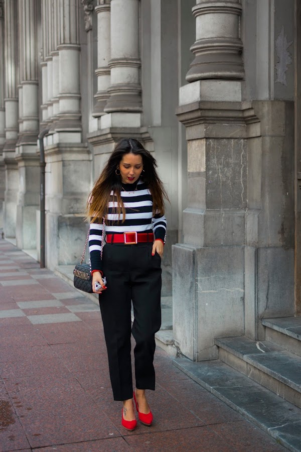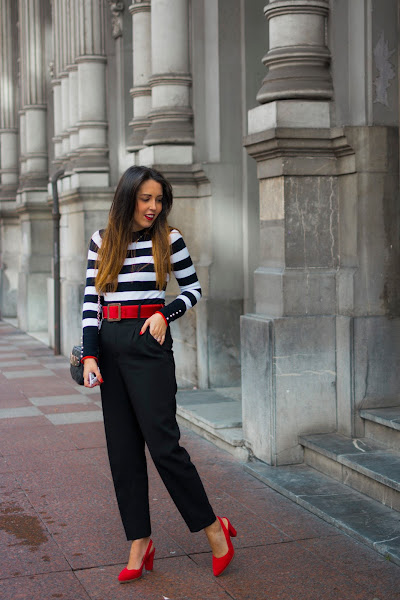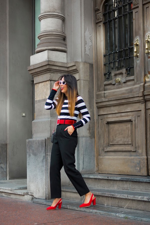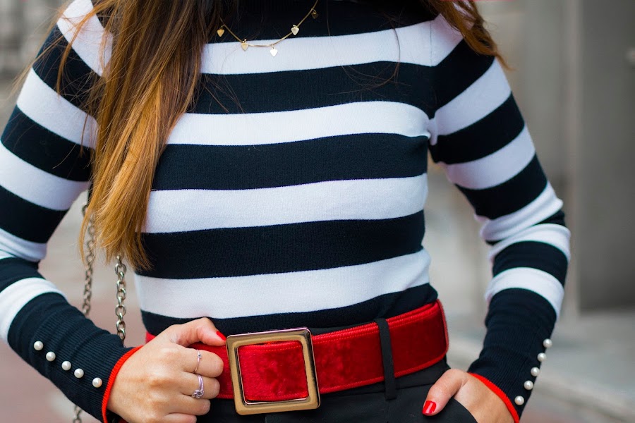 ¿Recordáis el pantalón del famoso traje viral que os enseñaba hace unos días? Hoy lo he reutilizado, he prescindido de su cinturón y en su lugar, he puesto uno bien llamativo en terciopelo rojo con hebilla de color dorado. El pantalón parece otro ¿verdad? Lo combiné con un sweater fino que me compré hace unos días, me gustó mucho el detalle de perlitas en las mangas y también, su final en rojo, ideal para seguir con el juego de colores de este look. En rayas, con aire navy se complementa con las gafas en color blanco. Un bolsito pequeño y elegante, es el siguiente elemento a destacar, perfecto para llevar lo imprescindible.