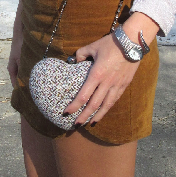 Para finalizar mi atuendo, opté por un lazo color chocolate al cuello, me pareció que iba genial con la falda. Para conjuntar mi camiseta de manga larga elegí mi bolsito en forma de corazón que me habéis visto anteriormente aquí.