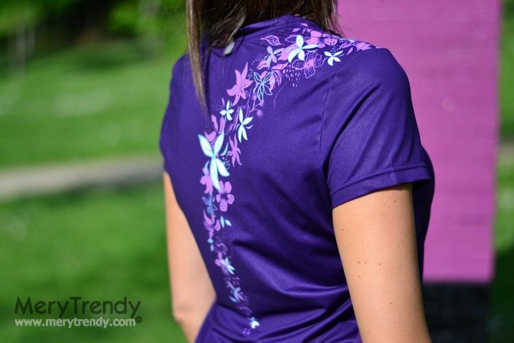 Da la camiseta que llevo destacaría detalles como el de la guirnalda de flores descendiendo por la espalda. Una prenda que me enamoró por la originalidad de su estampado, pero también por la suavidad y comodidad de la Lycra incorporada en el tejido y, cómo no, por su compuesto de Coolmax que la mantiene más tiempo seca (y eso es algo a tener en cuenta, ¿no creéis?). Además, el patrón semi-entallado permite libertad total de movimientos a la vez que destaca la silueta.