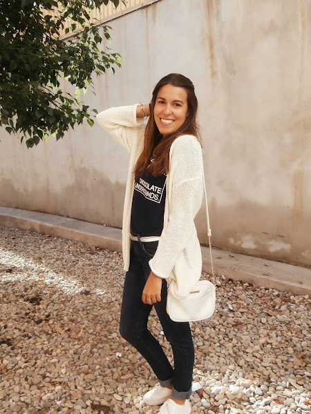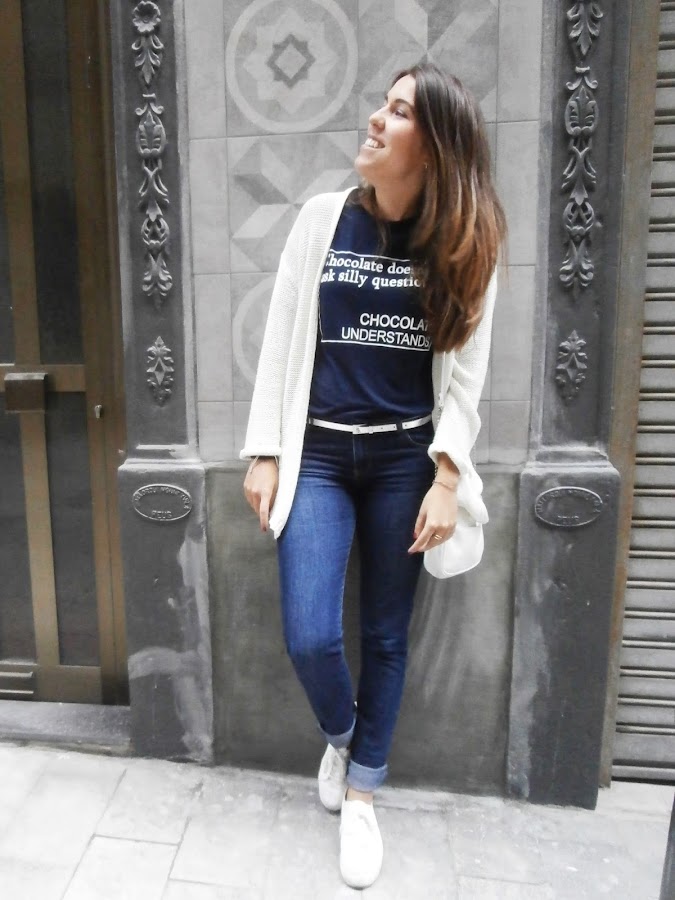 Today I wear an easy blue outfit. T-shirt is from Bershka, with the quote "Chocolate doesnt ask silly questtions... Chocolate understands" and everyone know that its true. The jean is old and is from Stradivaius. Shoes are from Brandy by 393 from this last spring, the cardigan is from H&M wen I was in Iyalyand the bag from Bershka.