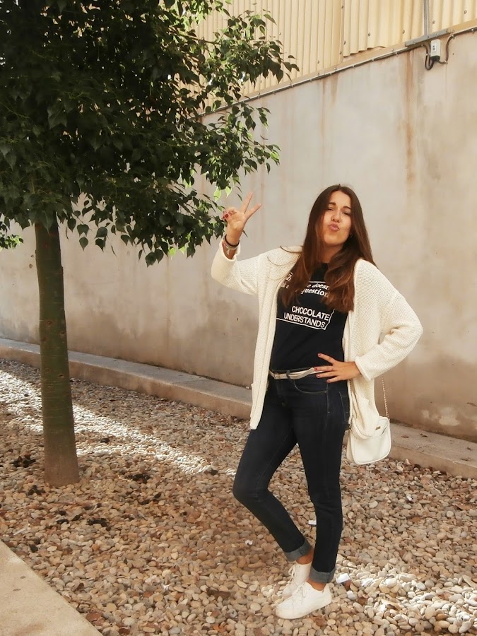Hoy llevo un look sencillo y azul. La camiseta es del año pasado de Bershka, con el mensaje "Chocolate doesnt ask silly questtions... Chocolate understands" y todas sabemos que es cierto. El pantalón es de hace bastantes años de Stradivarius, que casi nunca me lo pongo porque es bajo de cintura y me siento extraña. Las zapatillas son de Brandy by 393 de esta primavera pasada, el cardigan es de H&M de cuando estuve en Italia y el bolso de Bershka.