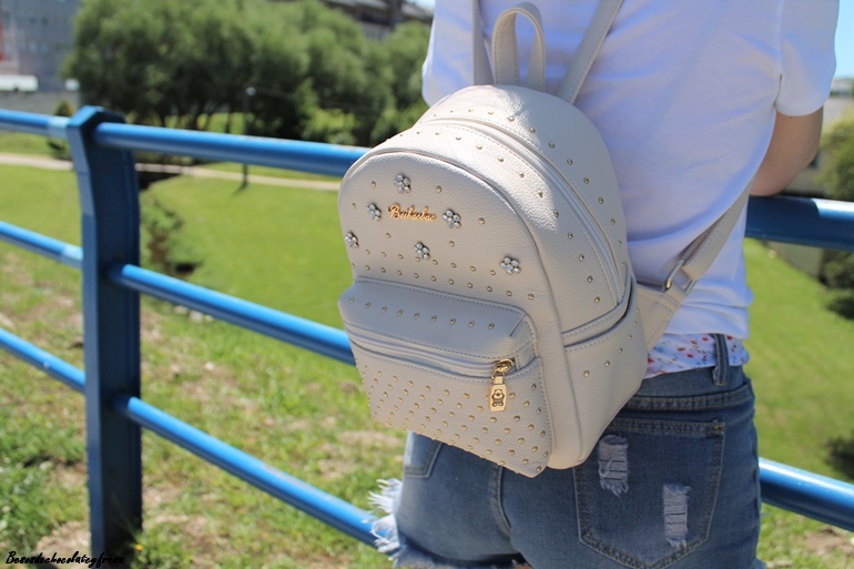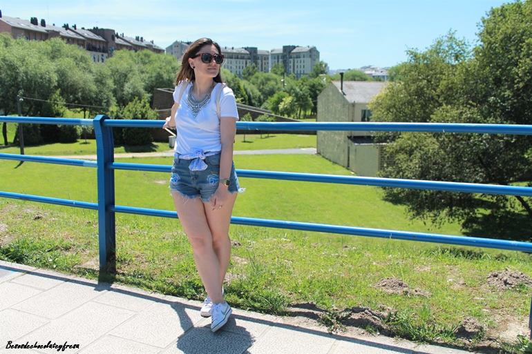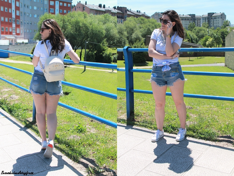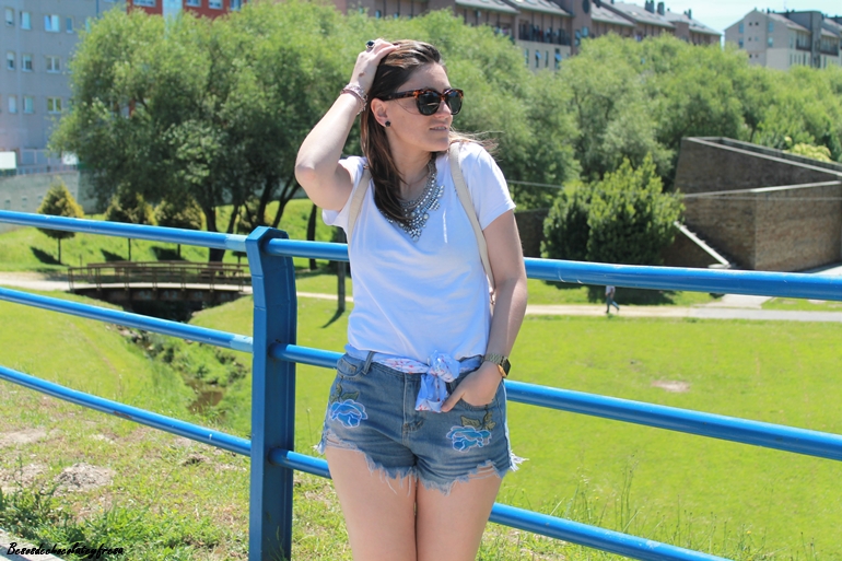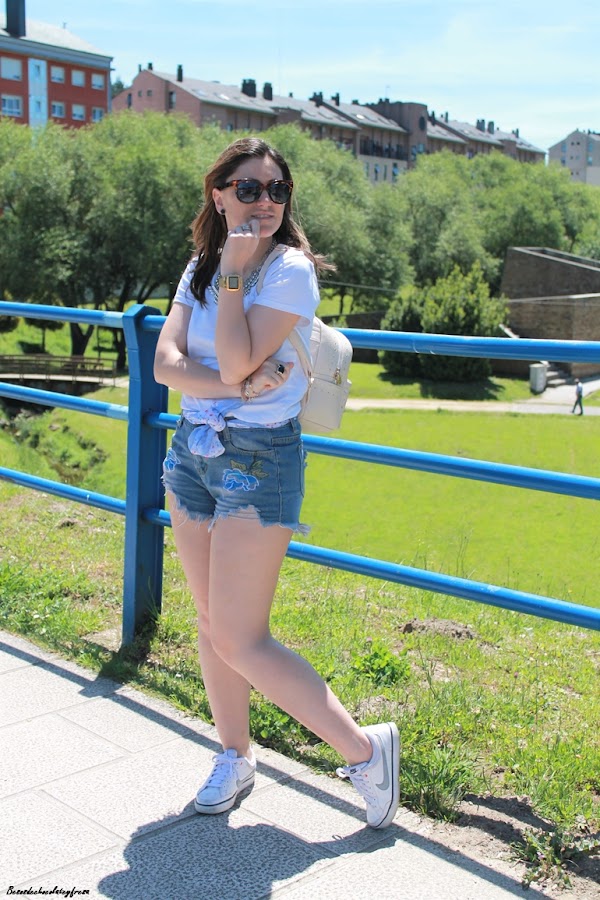 En el outfit de hoy os enseño estos shorts desflecados con bordados de flores en azul que acompañé con un pañuelo en las mismas tonalidades y estampados a modo de cinturón. Camiseta básica en blanco y de manga larga con maxi-collar plateado para darle un toque chic, sneakers y mochila en crema para hacer el look aún más cómodo.