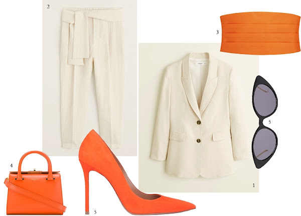 En orden: Americana beige, Mango (49.99€) Pantalones con lazo, Mango (29.99€) Fajín naranja, TND Basics (19.00€) Bolso mini, Serapian (1593.00€) Salones, Pura López (190.00€) Gafas de sol, Zara (15.95€)