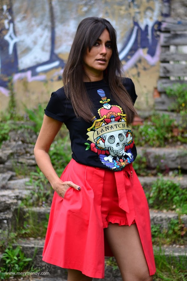 En esta ocasión, he elegido un modelo de su última colección: The Stolen Collection, muy rompedor, en negro, que he conjuntado con short & sobrefalda coral en algodón elástico de cinturilla con trabillas que sujetan el cinturón, que se abrocha a modo de lazo, también de la nueva colección SS18 de Pati Conde by Dándara.