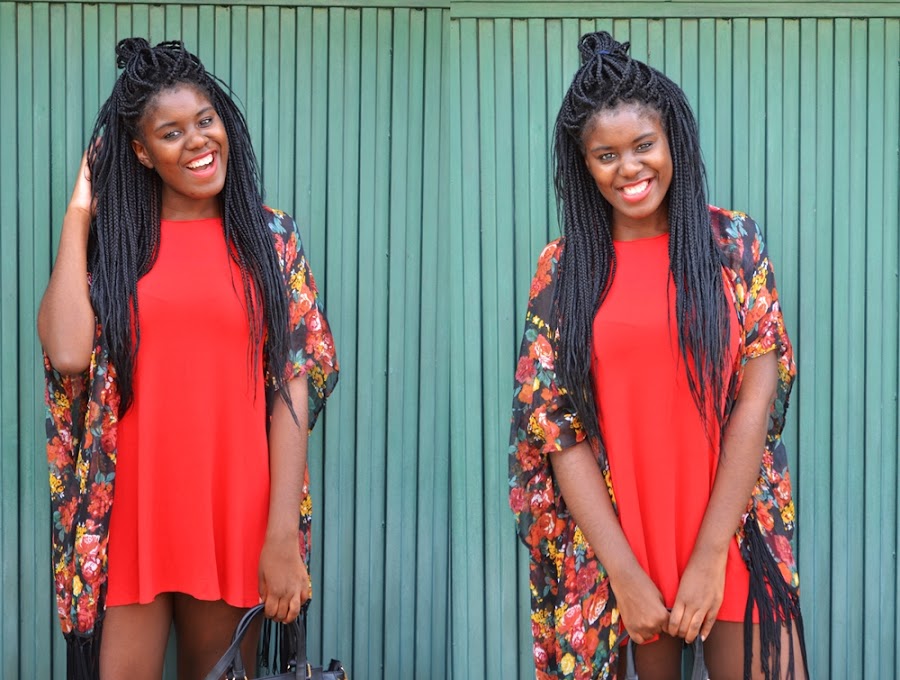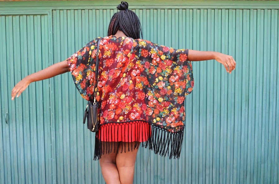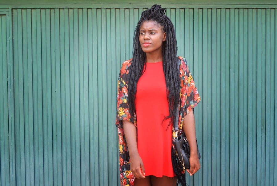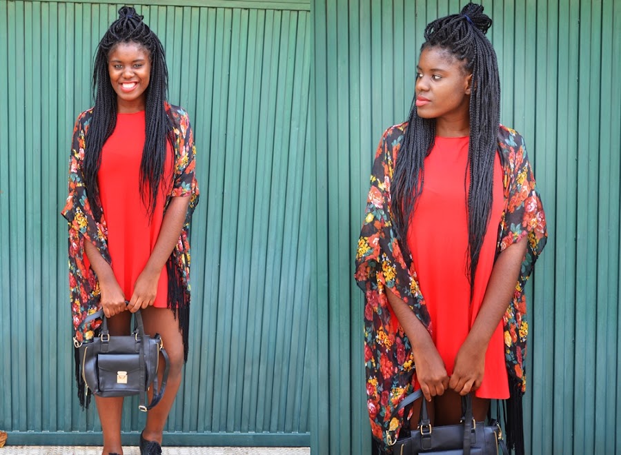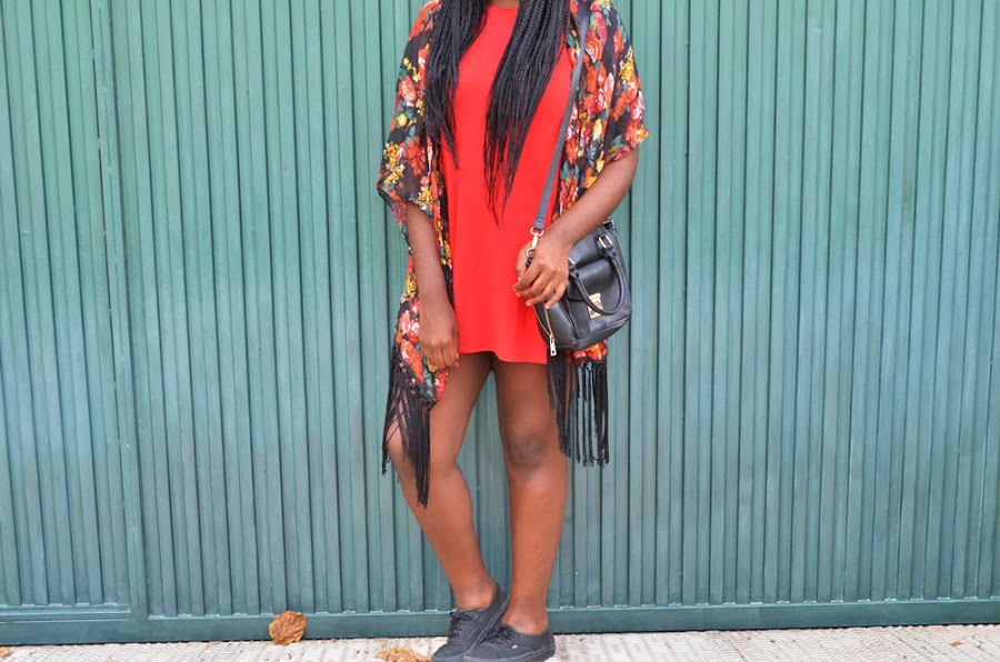 Quizá por sus tonos, por las flores o porque me pilló con un vamos a ver que tal queda... lo vi encima de la cama de mi madre (que además lo pensaba regalar) y lo combiné con mi little red dress, zapas y bolso en negro que ya bastante color llevo en el outfit.