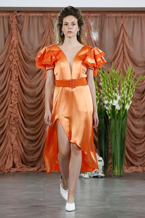 Las creaciones de raso de Beatriz Peñalver, que añade un toque español a cada pieza de su colección, se inspiran esta vez en los vestidos de fiesta que se llevaban en la Marbella de los años 70, veremos bordados, drapeados, tul y volantes. Es una colección que merece la pena destacar debido a su gran trabajo reuniendo reminiscencias de aquellos años, esto le añade una estética retro que resulta original y muy divertida.