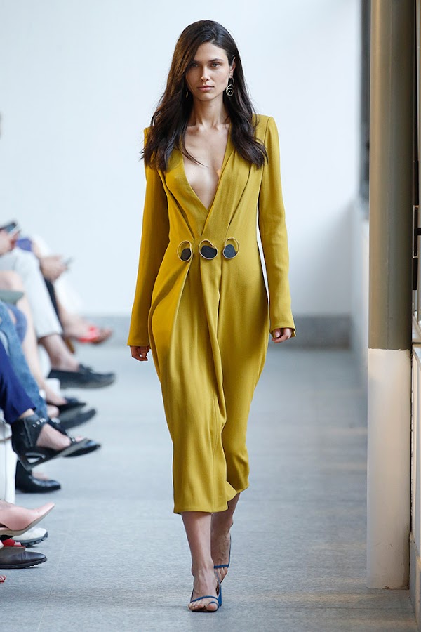 El vestido color mostaza de Angel Schlesser es una de las creaciones del nuevo director creativo de la firma, Daniel Rabaneda, un diseñador muy laureado que parece dispuesto a reinventar la marca compartiendo los valores que caracterizan la firma desde sus inicios y añadiendo sutiles innovaciones que la hacen crecer, manteniendo sus líneas depuradas y la sobria gama de colores.