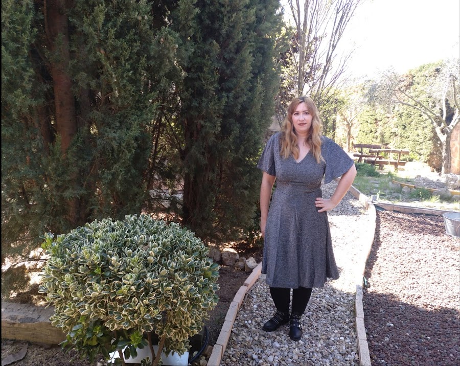Tenía muchas ganas de hacerme con un vestido en este tejido, no se explicaros como es, pero es el típico aspero que lleva hilo plateado entre medio, es un tejido un poco elástico y me encanta como queda puesto.
