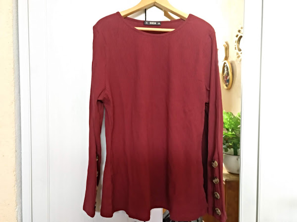 Esta camiseta es de manga larga, en tejido de canalé en color vino burdeos, las mangas tienen el detalle de tenerlas abotonadas con el adorno con cuatro botones. Su color vino burdeos hace una tez muy bonita, si tenéis la piel muy blanquita como yo y su precio no puede ser mejor y más económico. Si os gusta la prenda os dejo el enlace donde lo podéis encontrar AQUÍ.