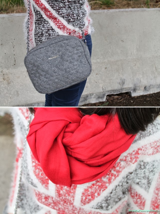 Lo combiné con tonos rojos como el foulard y grises como los botines tipo Ugg y bolso de cadena. Unos jeans básicos y listo el outfit de hoy :)