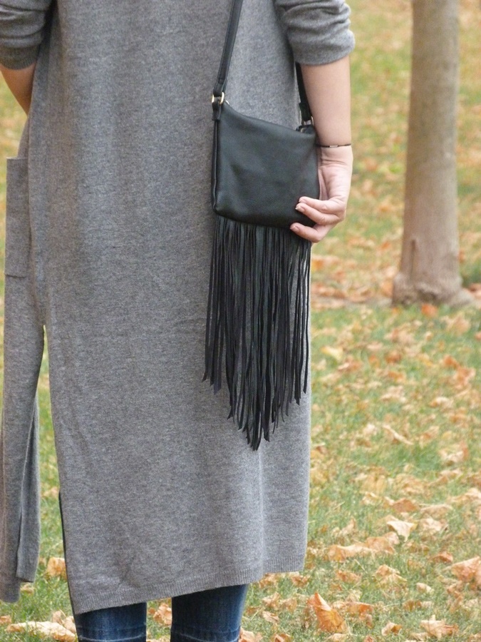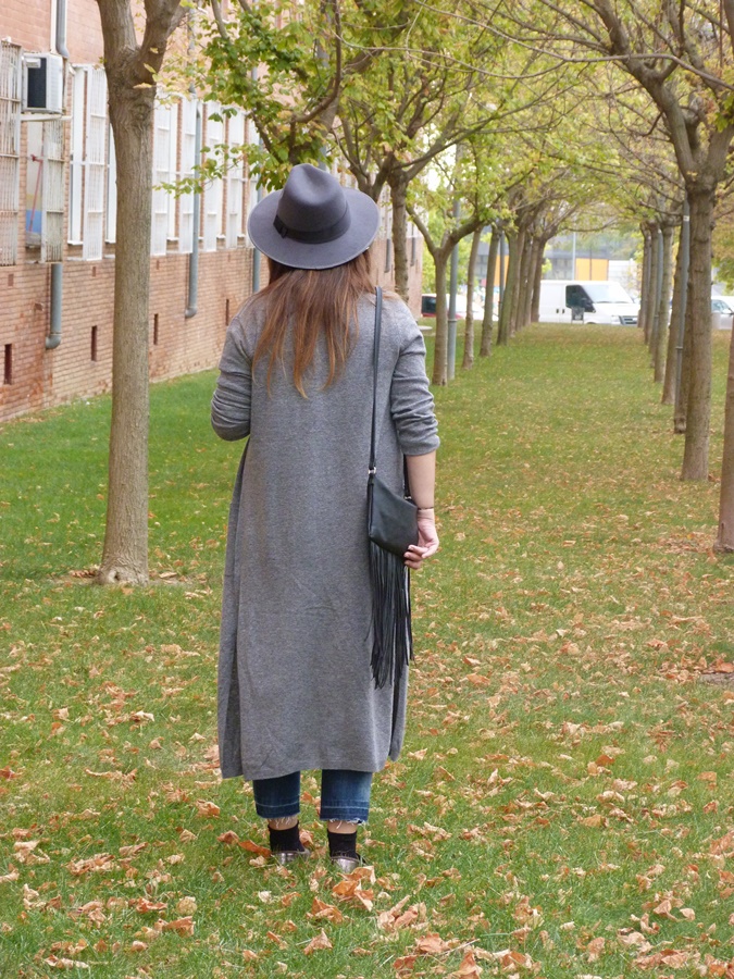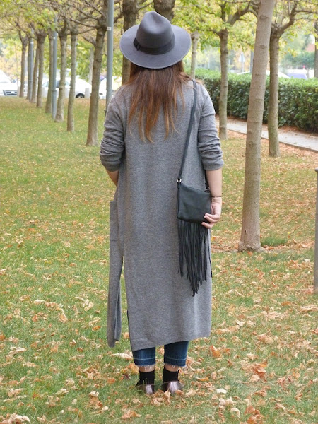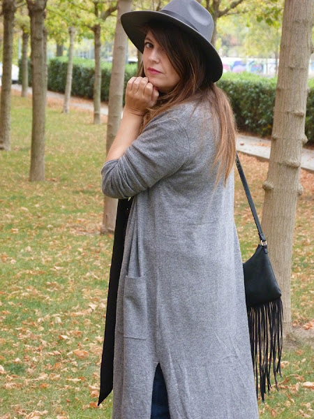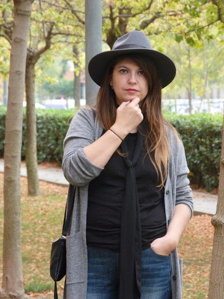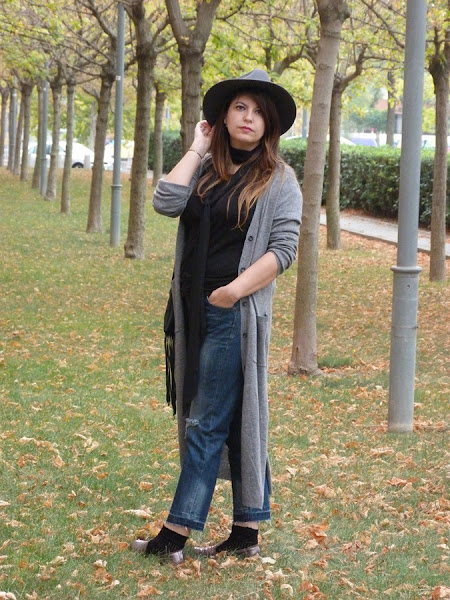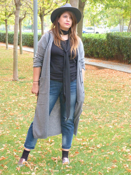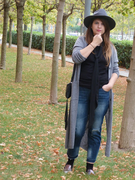 Hoy vengo con un look con una prenda de temporada con un largo inusual, pero me he acostumbrado y me parece super favorecedor, sobretodo para las que no somos muy bajitas y si lo eres taconazo y arreglado, el cardigan largo, lo he combinado en esta ocasión con pantalones cropped deshilachados por el bajo, camiseta negra y fulard tipo corbata, como complementos sombrero y bolso de flecos, tonos grises y negros con toque denim, espero que os guste ;)
