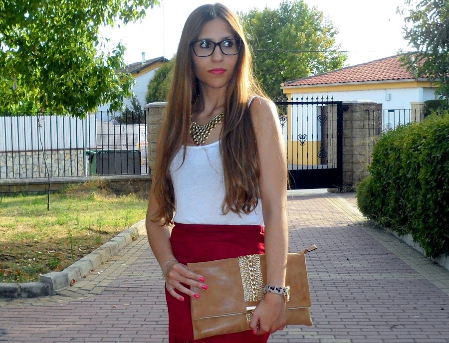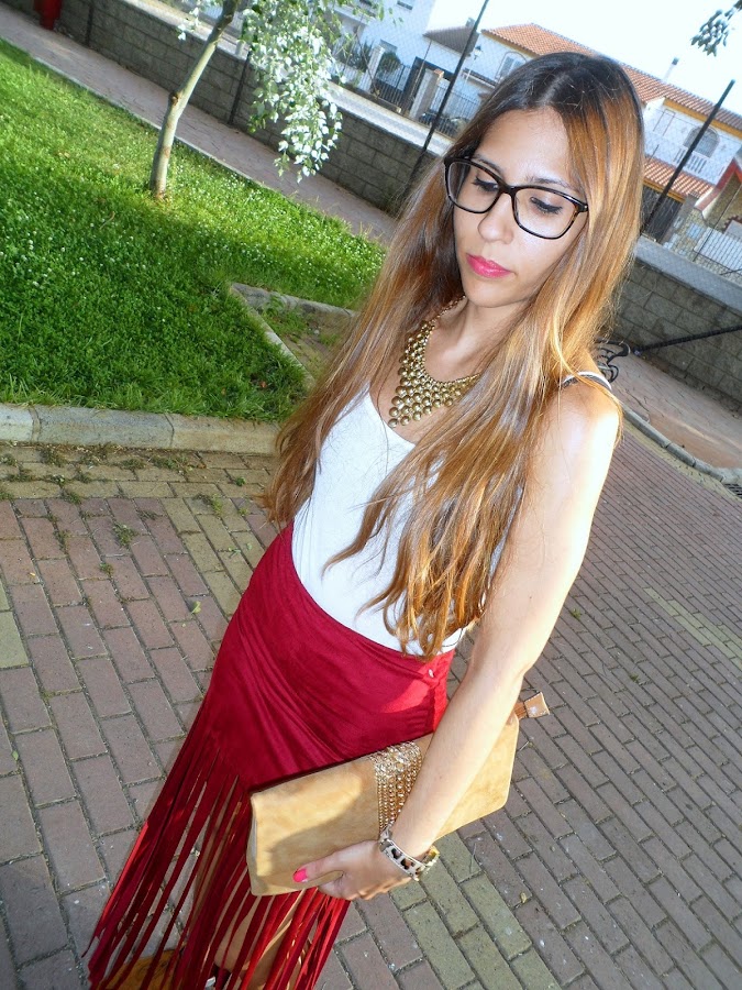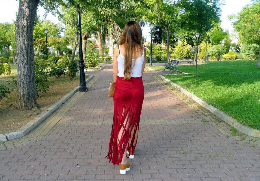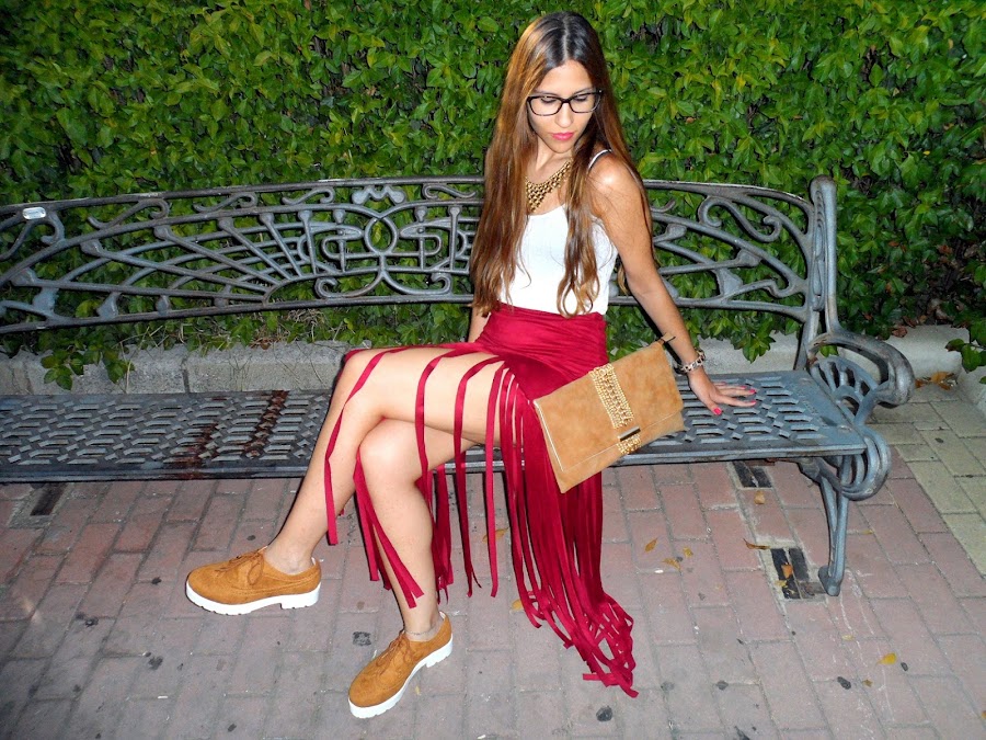 La prenda estrella de hoy, es la falda de flecos extra largos. Es de ante y tiene un color burdeos que le da mucha personalidad al look. Me encanta porque queda ajustada en las caderas como una mini falda pero los flecos tienen una caída que queda genial.