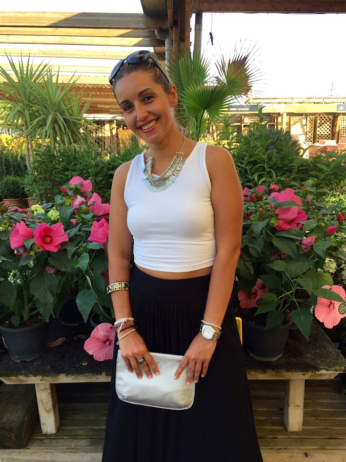 ¡Buenas noches sweeties! Ya estamos otra vez casi en fin de semana, y es que las semanas pasan volando y en nada, ya estamos de vacaciones. ¡Qué ganitas tengo de que lleguen! Una de las prendas que me encantan para llevar en verano son las faldas largas. En el look de hoy combiné mi falda larga negra con un crop top blanco, sandalias beige, collar de monedas y un bolso de mano en color plateado. Un look super sencillo y cómodo para llevar en estos días de calor.
