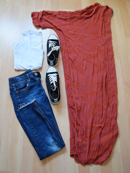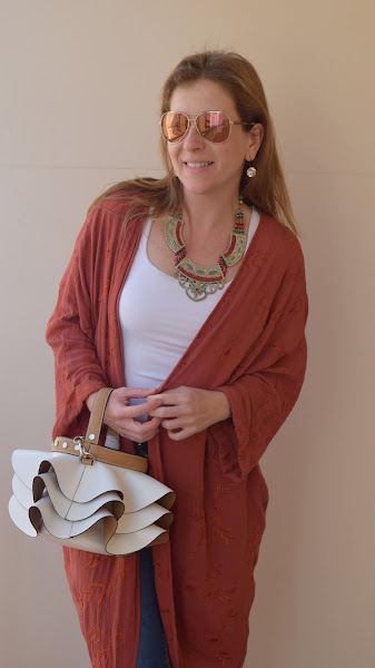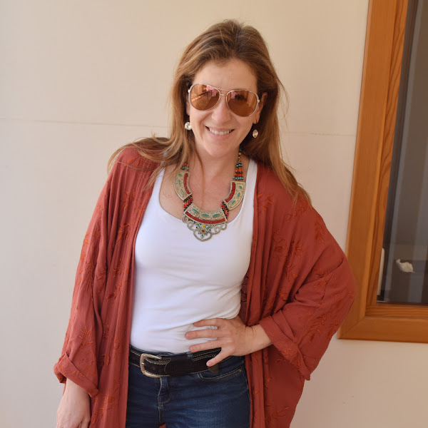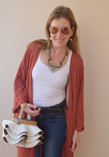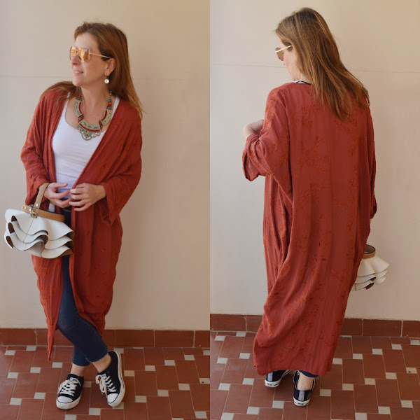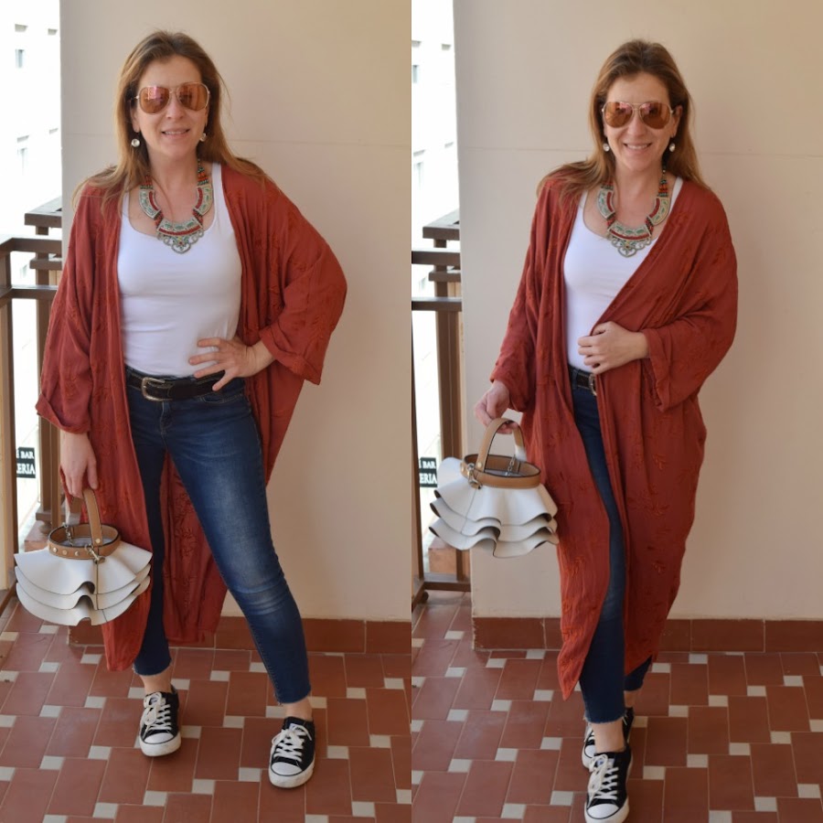 Para este primer look seleccioné las prendas que tenía más claras, vaquero con kimono, que está dando muy buen resultado esta primavera. Aunque algunos lo llamen bata da estar por casa...