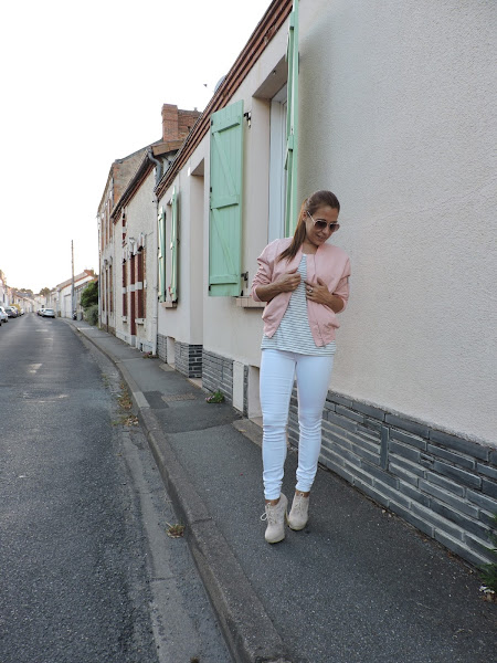 Parece que esta próxima temporada otoño/invierno la bomber se resiste a abandonarnos, aquí en Francia será la pieza it" de la temporada y por mi parte encantada, es una pieza cómoda con la que podemos crear una gran cantidad de look, yo os tengo preparados dos, hoy os enseño este, decidí combinarla con unos jean blancos de New yorker y una camiseta básica navy de Kiabi y los zapatos son de Shes en cuanto a la bomber es de SHEIN si os gusta la podéis conseguir AQUÍ >> http://goo.gl/U128dE