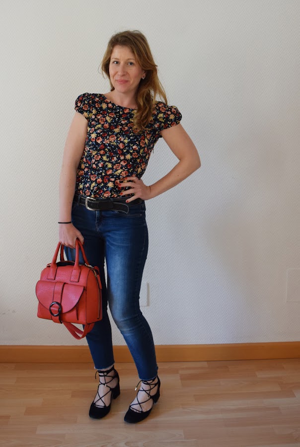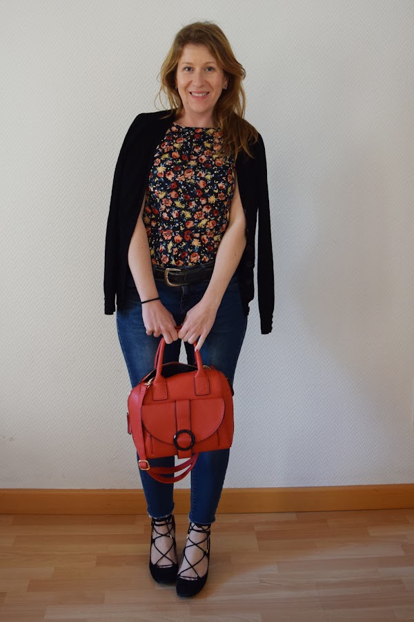 Por lo demás, añadir los zapatos tipo lace up, que me gustan mucho con estos vaqueros cortados, y un bolsito colorido, como este rojo de tamaño ideal para el día a día, y la chaqueta negra para la oficina, donde paso un poquito de frío...