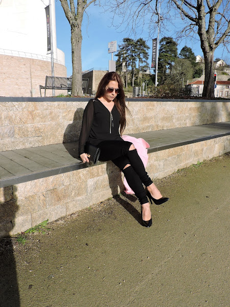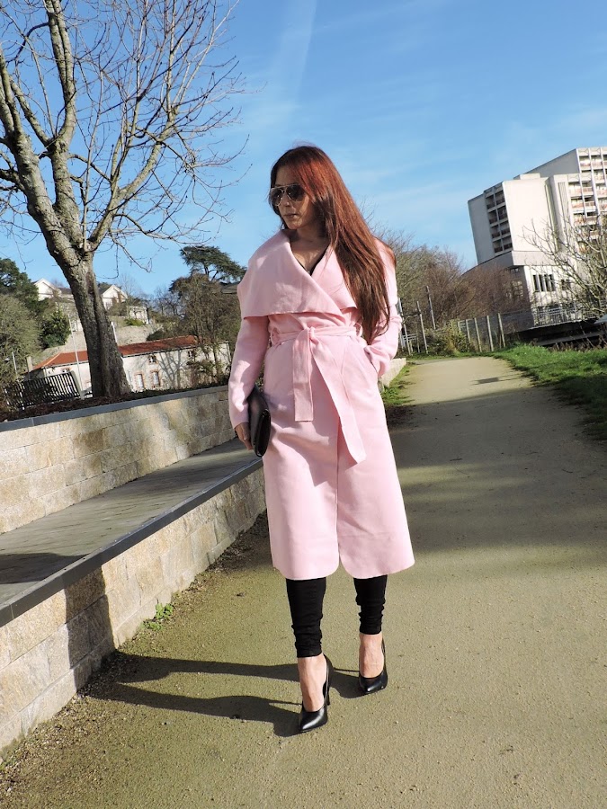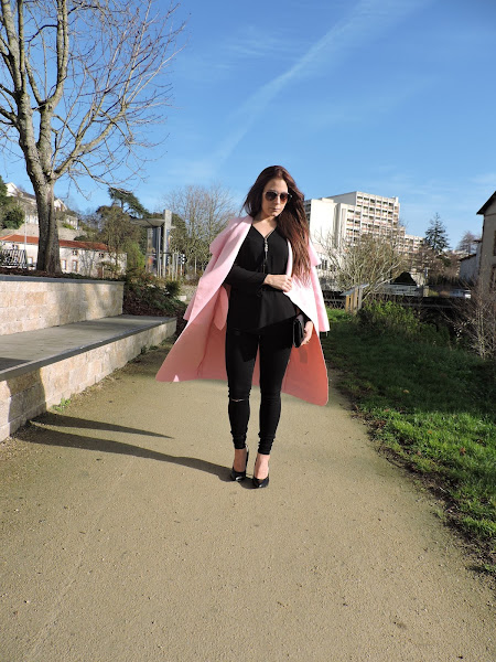 Como sabéis tengo una gran debilidad por el color rosa, y cuando vi este abrigo no me pude resistir lo podéis encontrar --AQUÍ-- lo combino con un total look negro y unos toques de dorado en la blusa y el bolso, para que el abrigo sea el total protagonista de este outfit. como único accesorio el bolso.