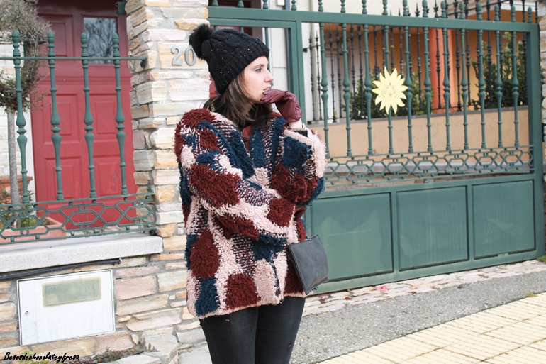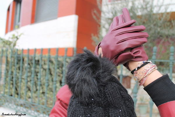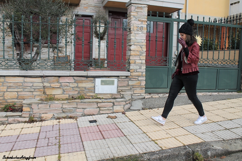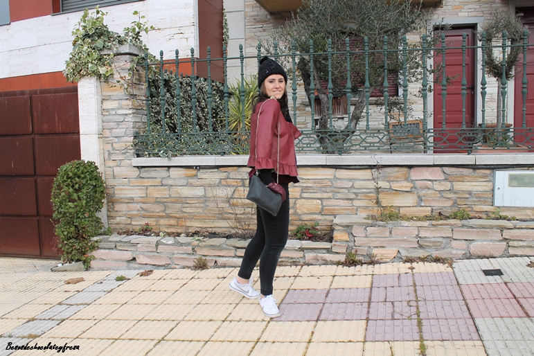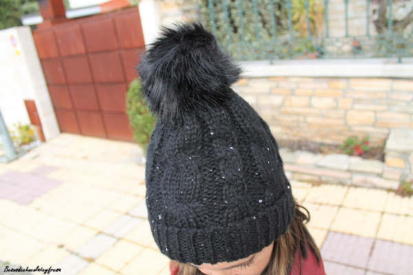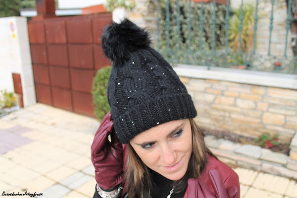 Como complementos opté por nuevo gorrito de peluche en el interior, la mar de gustoso, incluso te aisla de los ruidos al llevar en el interior las orejas bien protegidas, compuesto de pompon y lentejuelas. Guantes de polipiel en el mismo tono del look, burdeos, collar de oso de Tous y bolso bandolera. Jeans en negro y sneakers completan todo el look.