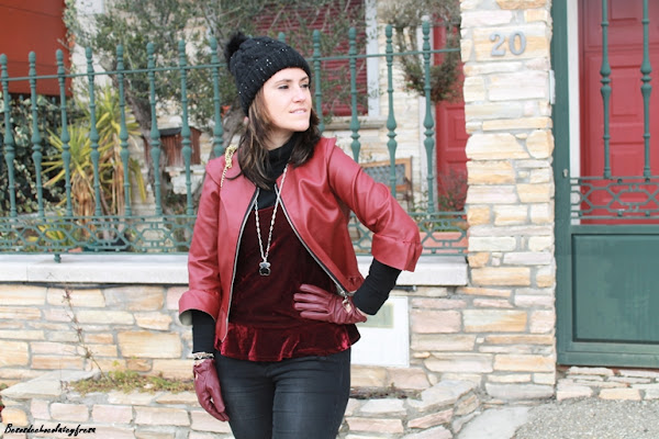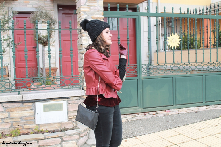 Por debajo llevo mi nueva chaqueta de polipiel en burdeos y volantes tanto en manga como en la parte de abajo, que en los días de menos frio podremos llevar sin nada por encima para lucirla al máximo. Sweater negro de cuello vuelto con top de peplum y terciopelo granate a modo de superposicion.