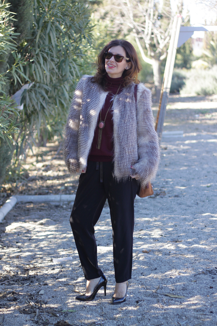 Today I wear a look with one of my favorite faux fur coats. As the coat itself is striking, I decided to go for basic and wear turtleneck in burgundy and black dress pants. Would not say that less is more? Again I carry my PG bag and black heels. Thank you very much for all your comments!