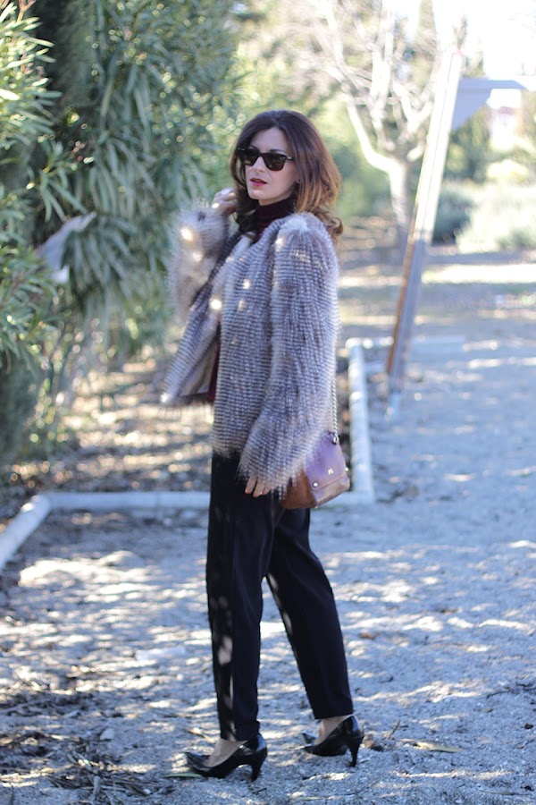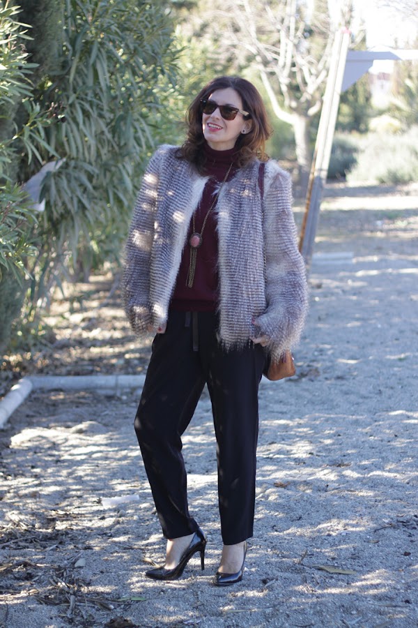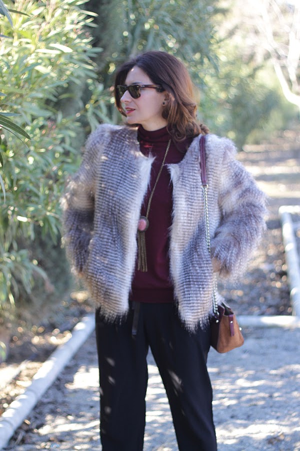 ¡Ya estamos a mitad de semana! Hoy os traigo un look con uno de mis abrigos de pelo favorito, creo que en la foto no se aprecia lo bonito que es ^_^. Como el abrigo es llamativo, decidí apostar por básicos y me puse jersey de cuello alto en color burdeos y pantalones de vestir negros. ¿no dicen que menos es más? Otra vez llevo el bolso de Purificación García (¡no sabéis el juego que da un bolso en esos tonos, me lo habéis visto en multitud de looks como aquí, aquí o aquí!), y zapatos negros de tacón. ¡Muchas gracias por todos vuestros comentarios!