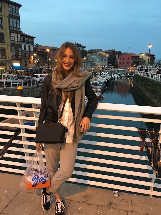 Para la noche lo que hice fue cambiar el maquillaje y meterle el labio rojo y la bufanda que hacía fresquito en la zona del puerto de Llanes, ¿no es precioso? veraneo aquí desde siempre y me sigue enamorando.
