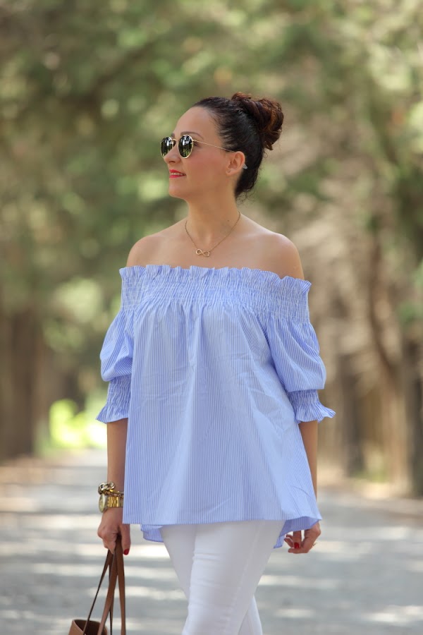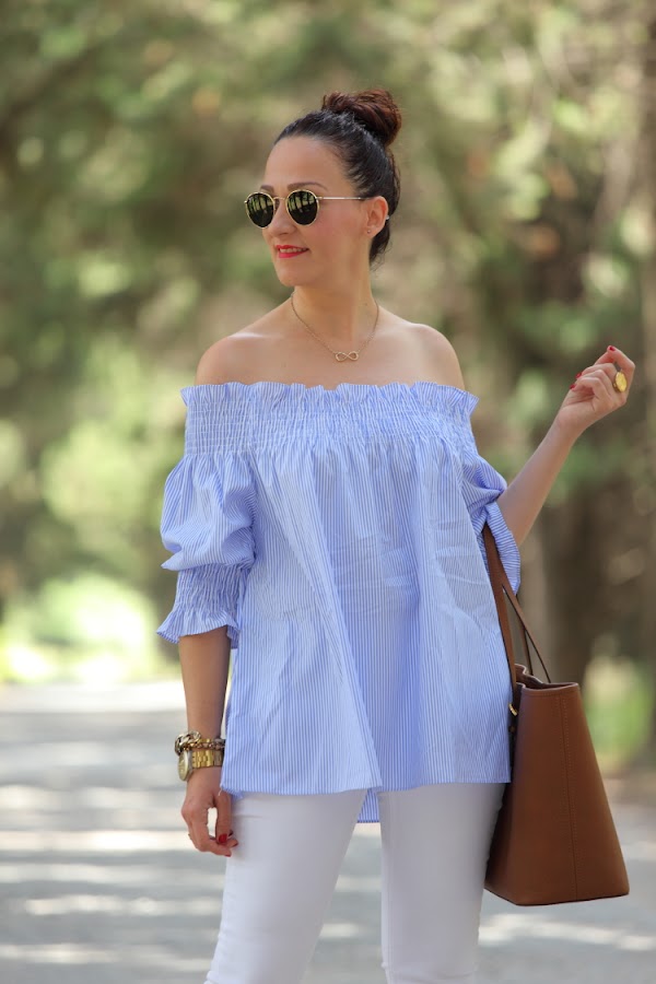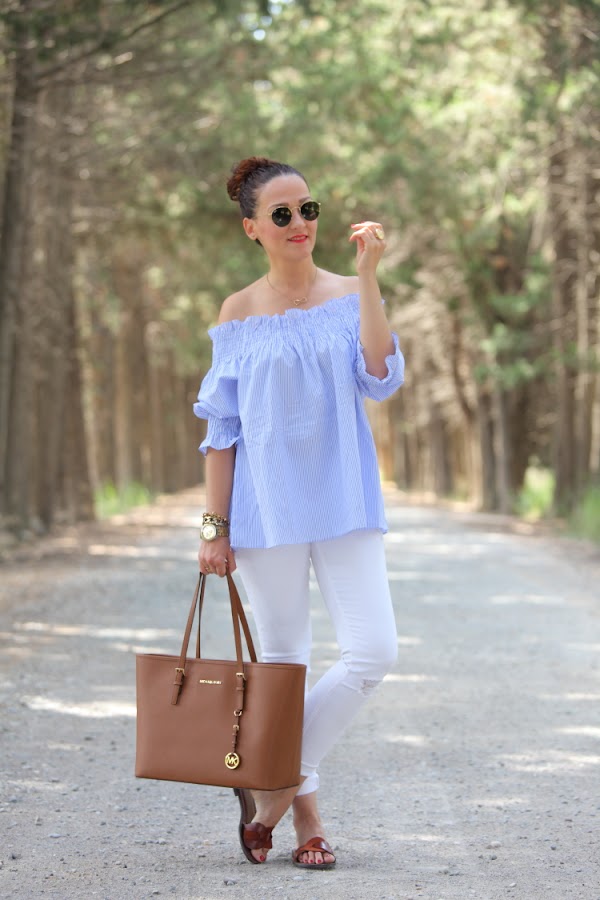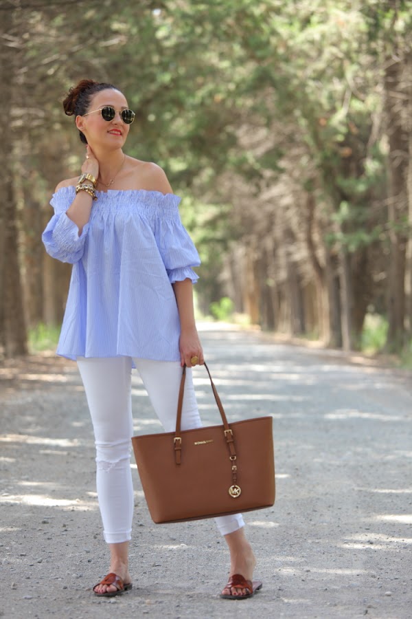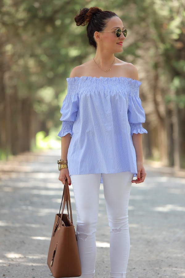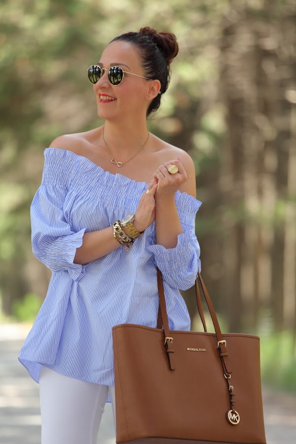 Como ya os comenté hace unos días, no se qué me ha dado este verano por el azul. No es que no me guste este color, pero es que no sabéis la de ropa que me he comprado. La última este top de nueva temporada con escote Bardot que tiene un fino estampado de rayas blancas y azules. Lo estrené junto con unos pitillos blancos, palas marrones y mi nuevo bolso de Michael Kors.