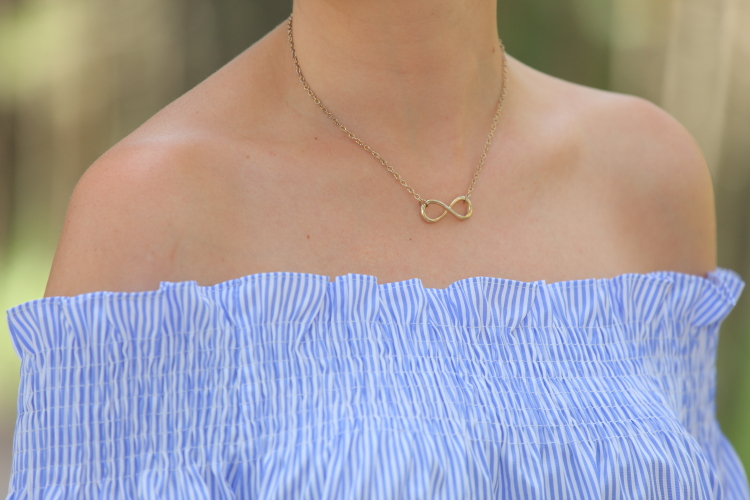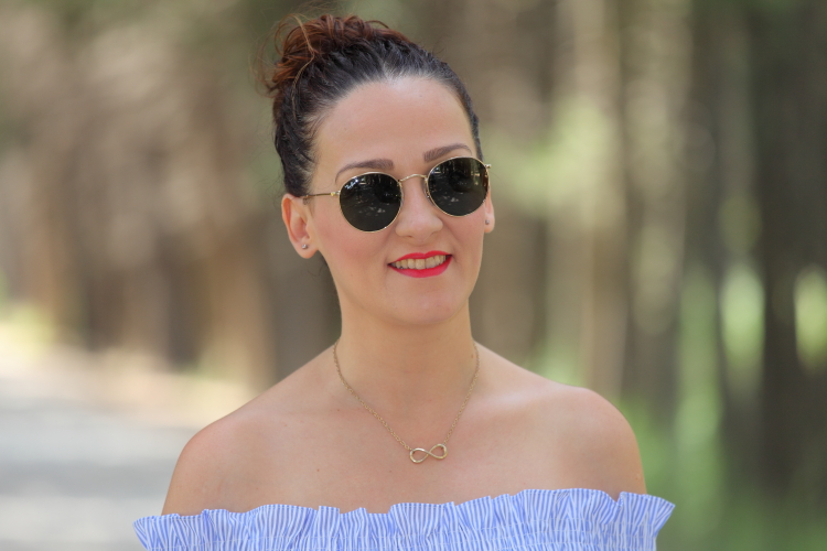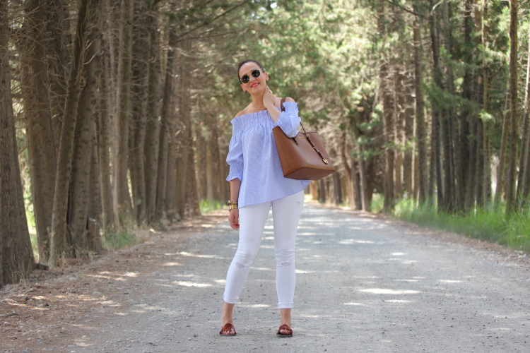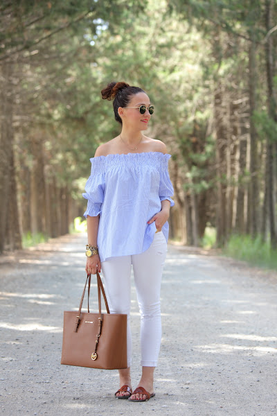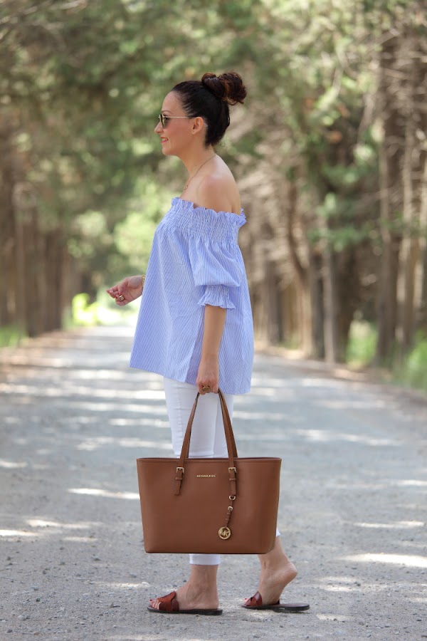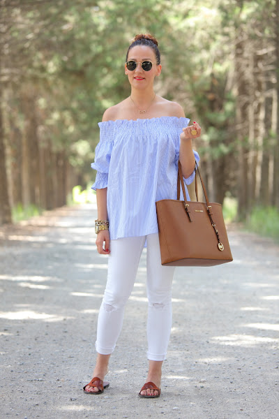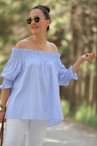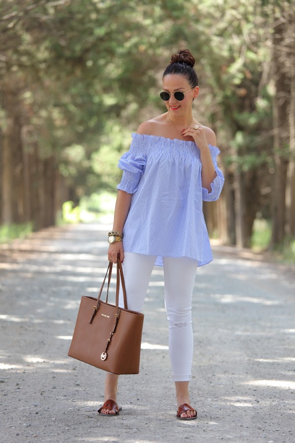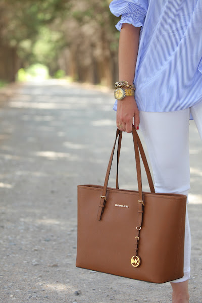 Como ya os comenté hace unos días, no se qué me ha dado este verano por el azul. No es que no me guste este color, pero es que no sabéis la de ropa que me he comprado. La última este top de nueva temporada con escote Bardot que tiene un fino estampado de rayas blancas y azules. Lo estrené junto con unos pitillos blancos, palas marrones y mi nuevo bolso de Michael Kors.