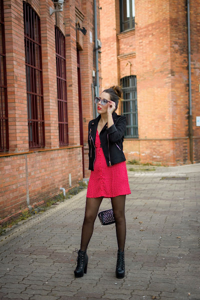 Los vestidos son una de mis prendas favoritas en cuanto comienza el buen tiempo, me parecen súper cómodos y llenos de estilo. Hoy he querido combinar uno en color rojo, de lunares que infinitas veces os he comentado que son tendencia, pero no es porque lo sean, sino porque me he aficionado a lo bien que quedan las prendas que los llevan. Lleva botones en la parte delantera y un corte precioso en la zona del pecho, es de Zaful. También de la misma marca, es la biker en color negro, con tacto de ante y llena de cremalleras plateadas y bien vistosas, para restarle dulzura al look y darle un aire rockero.