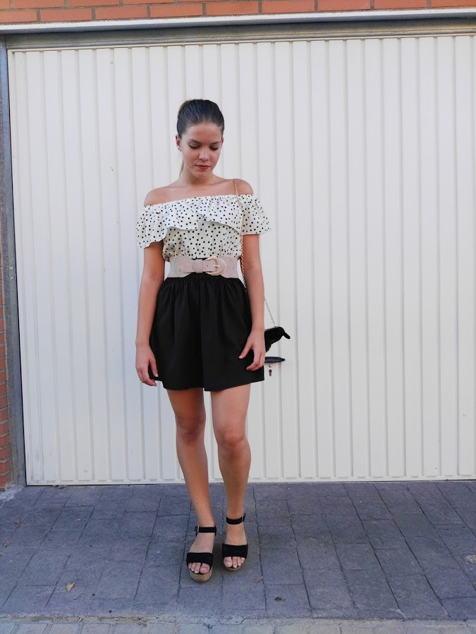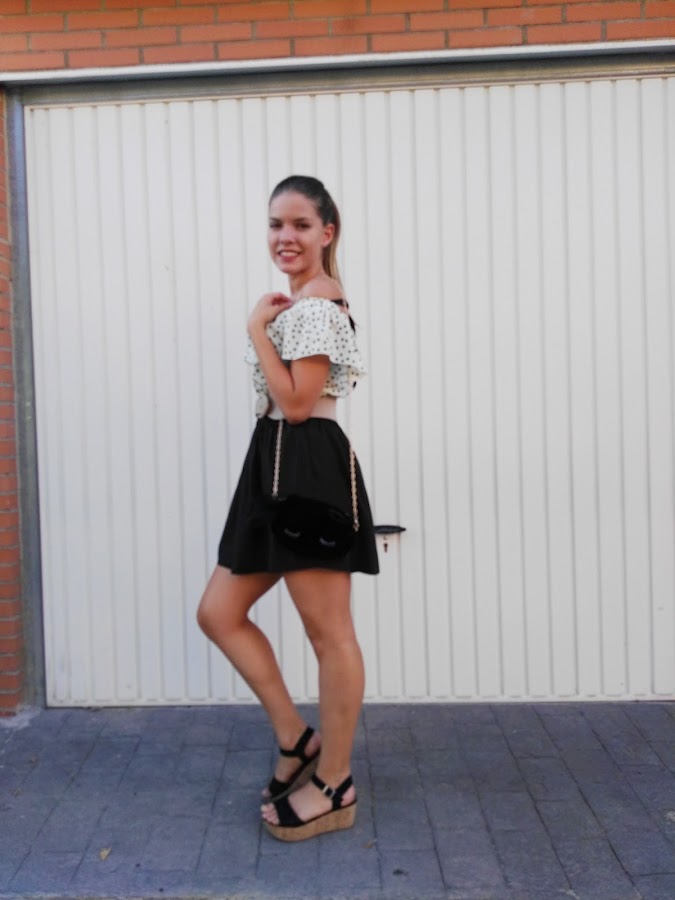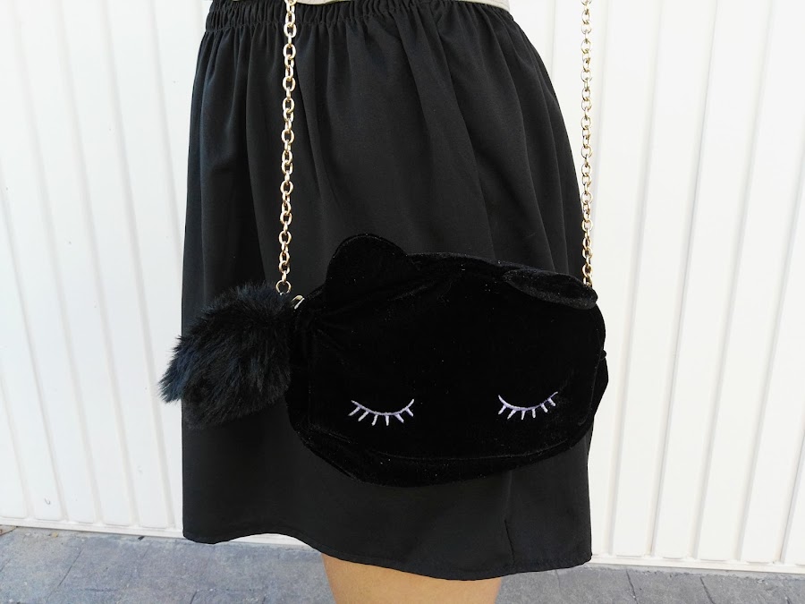Es un look muy básico en los dos colores más clásicos, el blanco y el negro. Lo que le da el toque al look es el bolso de gato, le da un toque divertido y le quita la seriedad al look.