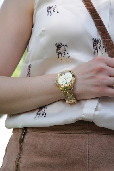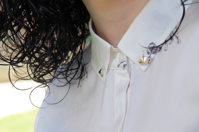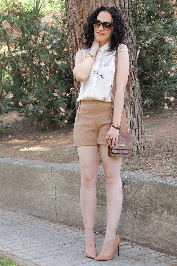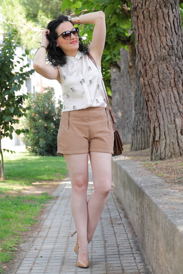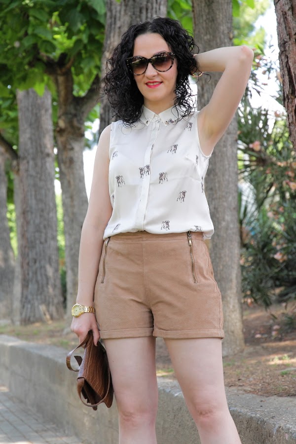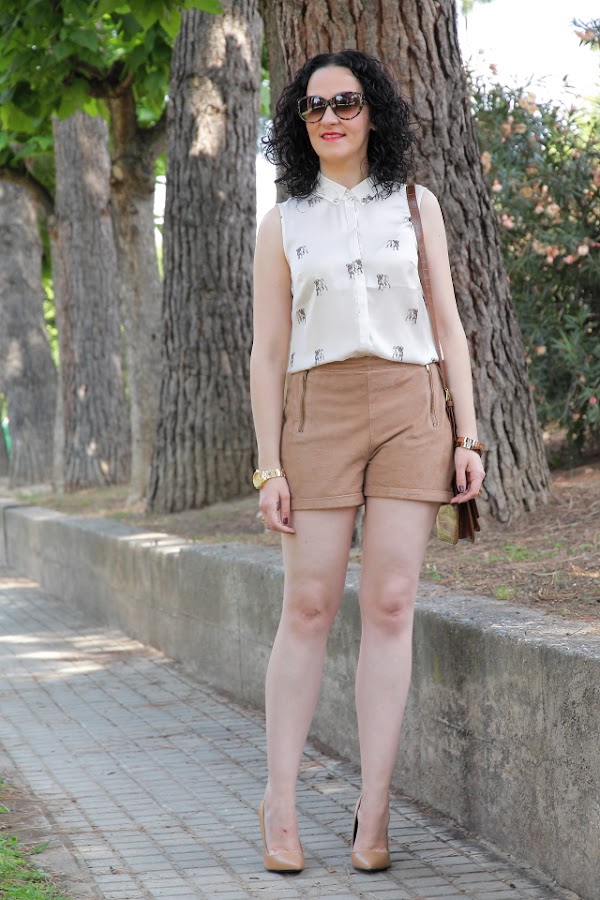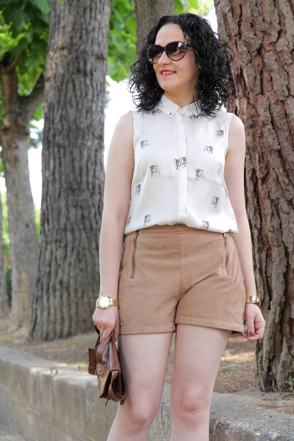 No soy muy dada a comprarme ropa con dibujos de animales pero este verano parece que algo está cambiando porque ya han entrado unas cuantas piezas en mi armario. Esta vez es el turno de esta preciosa camisa sin mangas con estampado de perros, fue un autentico flechazo cuando la vi en Zalando. Me gusta mucho su tela satinada, los dibujos de los perros en tonos marrones quedan muy finos no viéndose nada recargada y las tachuelas doradas del cuello le dan ese toque cañero que me encanta. Hoy la he combinado con mis shorts de piel, una de las mejores compras que he hecho esta temporada porque como ya estáis viendo les estoy dando mucho uso.