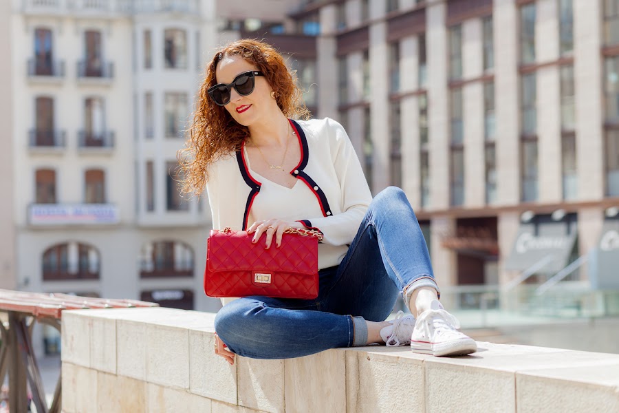Si de normal mi marido y yo ya somos de culo inquieto y en cuanto tenemos fiesta no paramos por casa, ahora que vienen los meses de calorcito mucho más. Para esos días me gusta la comodidad, y que mejor para ello que unos jeans y las Converse. Este día para darle un toque un poco más sofisticado le combiné un top lencero, chaqueta con cierto aire Gucci y mi bolso rojo favorito.