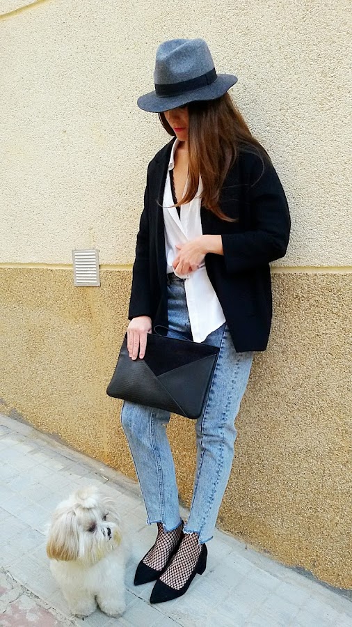 Para rematar el conjunto , me puse esta blazier negra larga , con mis zapatos del momento, y unas medias de rejilla para darle ese toque sexy junto con el sujetador de encaje.