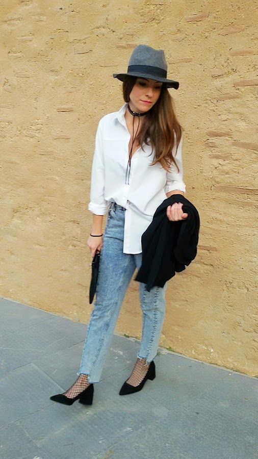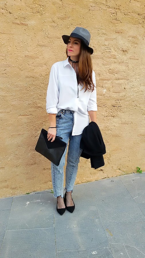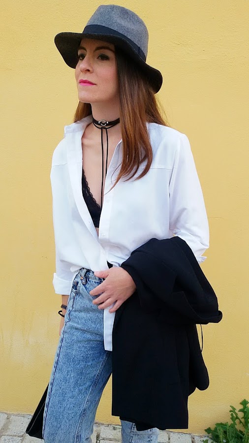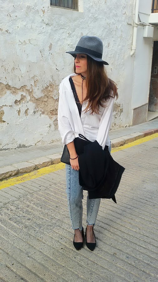 Combiné estos mom jeans que me encantan, por su corte asimétrico en el tobillo y su color desgastado, con esta camisa blanca oversize . Debajo me puse un sujetador lencero negro para poder llevar la camisa un poco desabrochada y dejar ver la puntilla del sujetador , una prenda que pruebo por primera vez y estoy segura que veréis más de un look con él,.