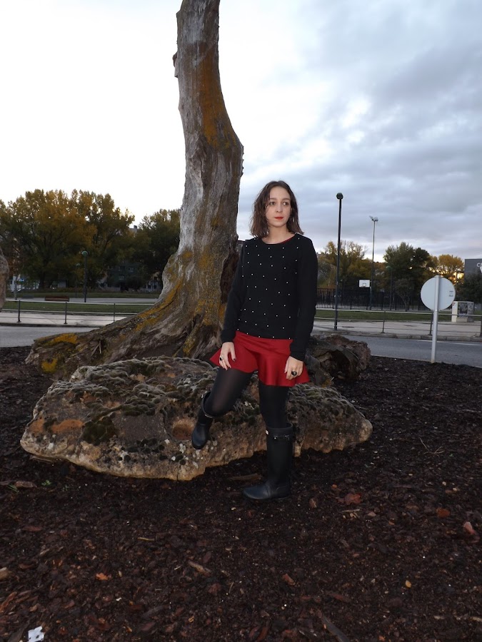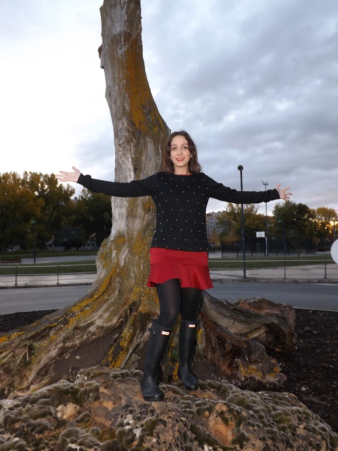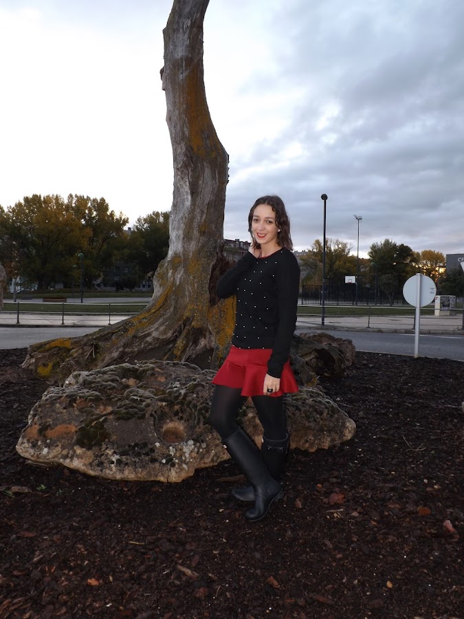 Y para estos días de invierno y lluvia que estamos teniendo nada mejor que las Hunter. Esta vez las he combinado con un vestido rojo a modo de falda y un jersey negro con perlitas.