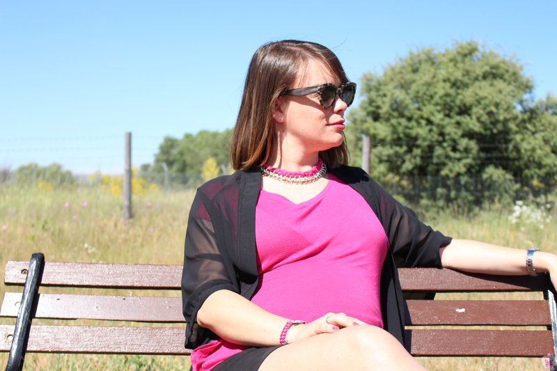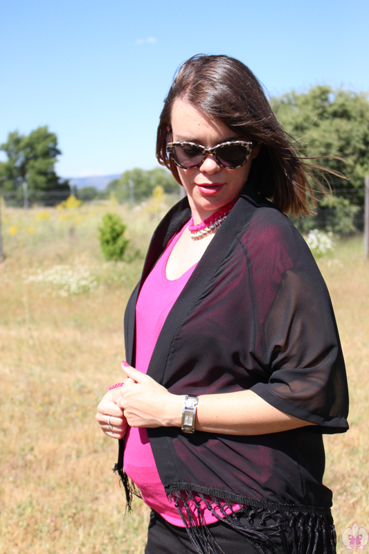 Y bueno, decidí combinar el kimono con la falda negra de pre-mamá y camiseta en rosa fucsia, y complementos de Artesam del mismo color, por lo que es un total look en negro y rosa, y que me ha gustado mucho el resultado.