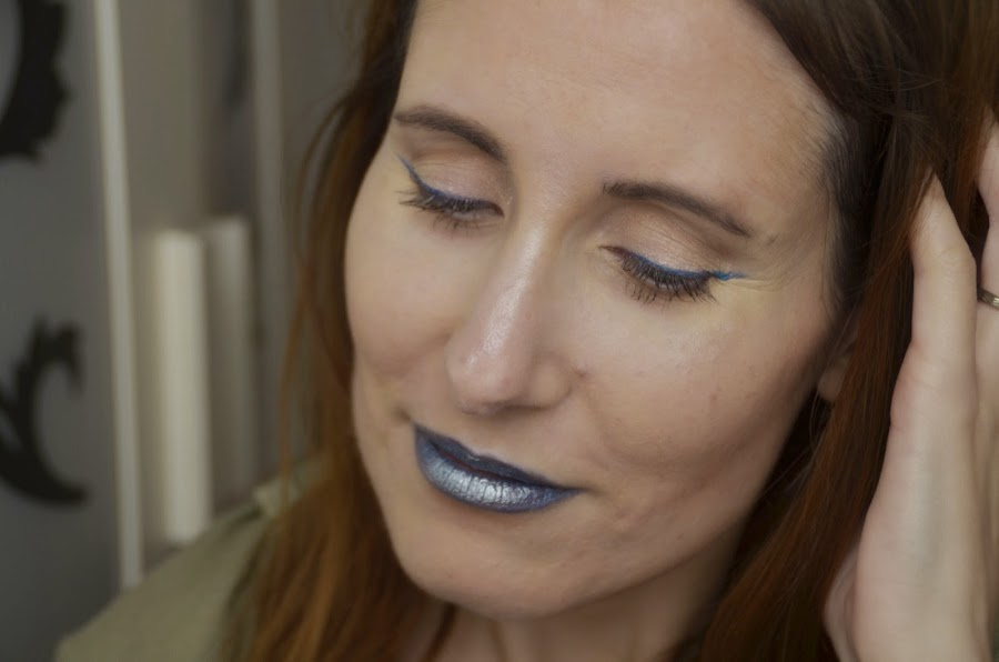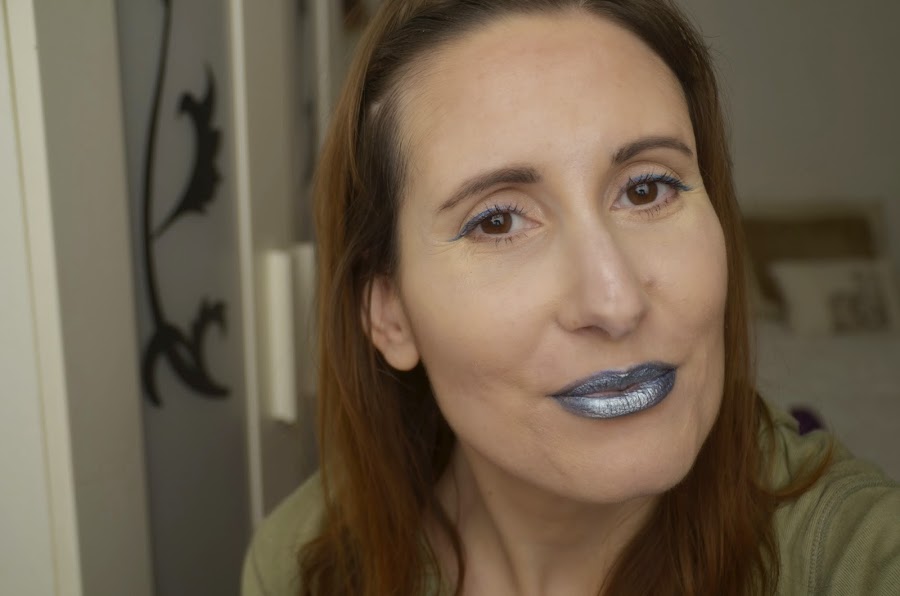 Para los labios primero perfilé con el mismo eyeliner en gel que usé para delinear mis ojos y luego cogí la paleta Vice2, con ella y la ayuda de un pincel plano fui depositando en los labios una sombra azul, una vez terminado de rellenar los labios con la sombra apliqué con los dedos un poco de sombra plateada, dando ligeros toques en la zona central de los labios.