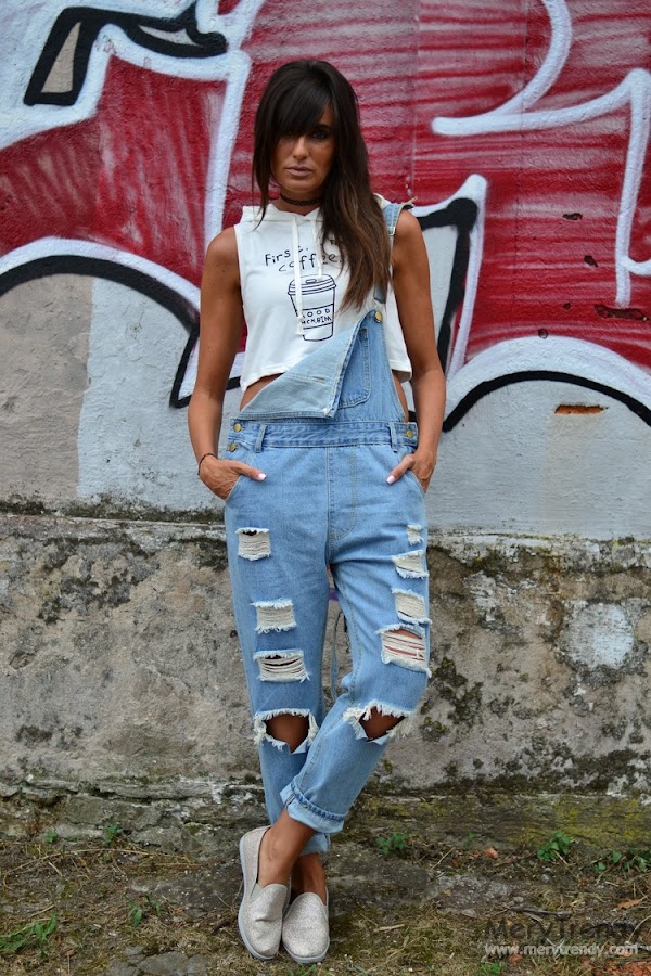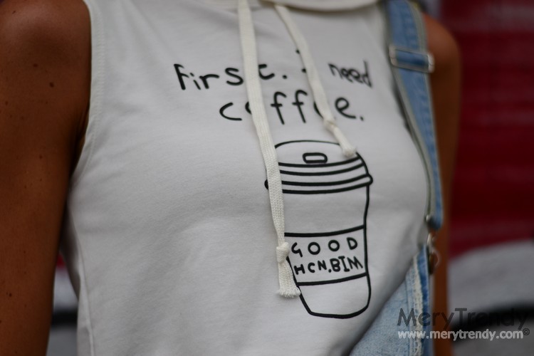 Volviendo al look de hoy, deciros que, no se me ocurrió mejor manera de estrenar mi peto denim que, por cierto, casi deja a la vista más piel que tejano... Jijij con un crop top con capucha en blanco, con el archiconocido lema estampado en la parte delantera del mismo "First, I need coffee", ahora que todavía hace calor. Una combinación un tanto arriesgada porque no todos los cuerpos están hechos para vestir prendas boyfriend ni crop tops.