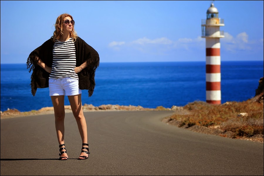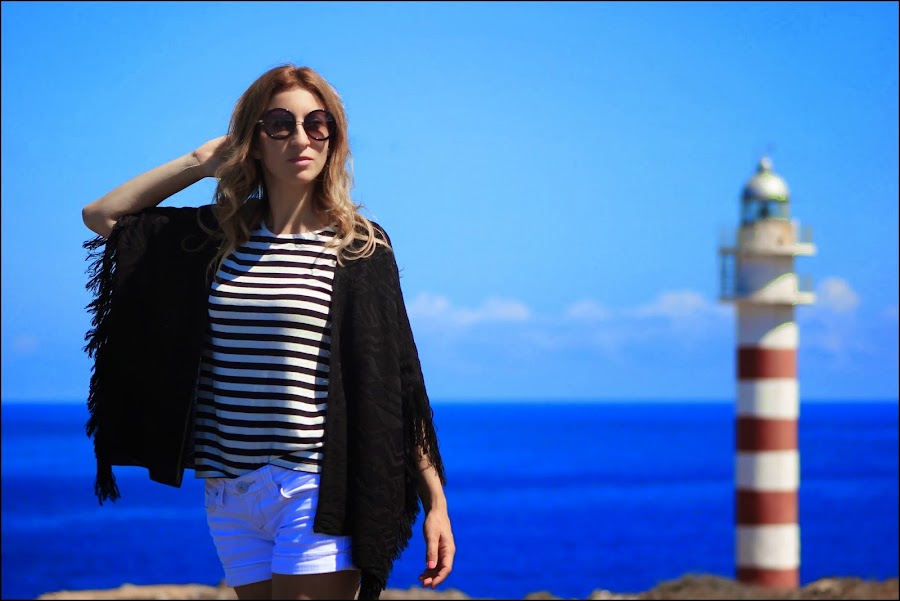 Por mi tierra canaria aún estamos en pleno verano pero no he podido resistirme a ponerme mi poncho de flecos. La propuesta que les traigo hoy, usarlo como un simple complemento para dar un aire diferente a un look casual y sencillo, con un short y una camiseta que me he puesto para dar un paseo de domingo.