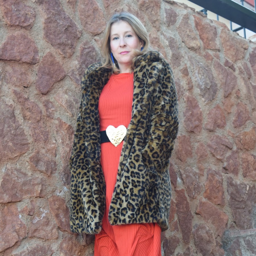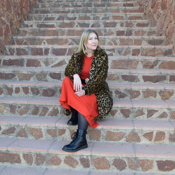 Vestido en color rojo, combinado con botas militares y abrigo leopardo calentito, para los días más fríos del invierno.
