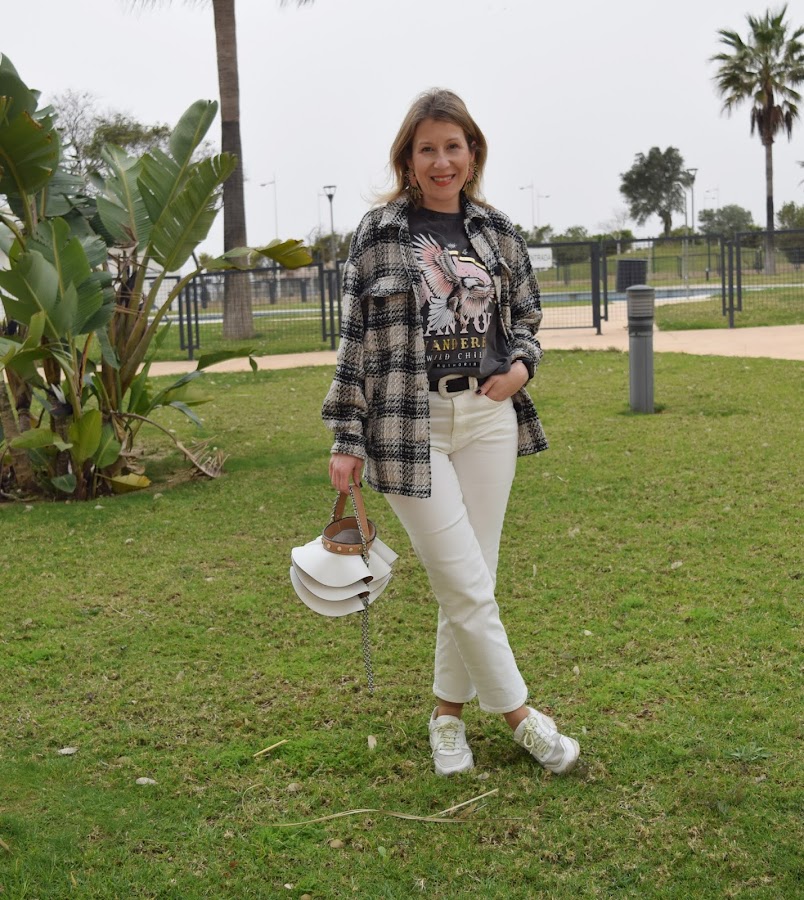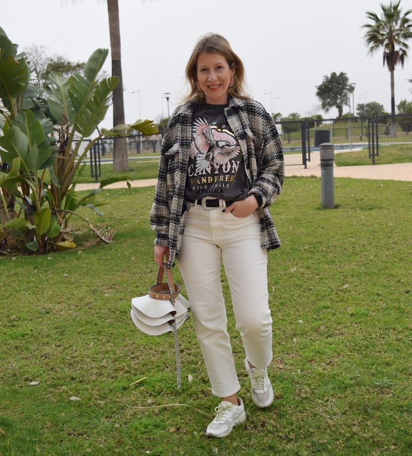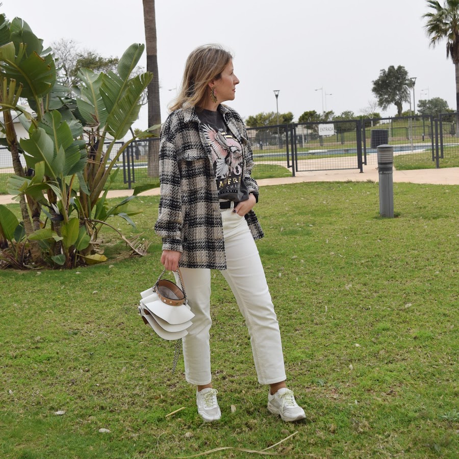 Combinado con una camiseta cañera, con un estampado que llama la atención, zapatillas y sobrecamisa de cuadros. Lista para pasar el día...aunque esté en casa!