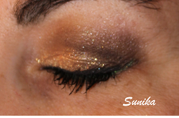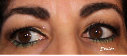 En los ojos dos sombras en crema de Kiko, en los dos primeros tercios del párpado un tono dorado el 01 y en el último tercio un marrón oscuro el 04. Difuminamos los cortes con la esponjita que llevan en la parte de atrás. En el arco de la ceja el tono Foxy de la Naked Basic. Bajo las pestañas inferiores delinee suavemente con el LongLasting 10 de Kiko que es un verde precioso.