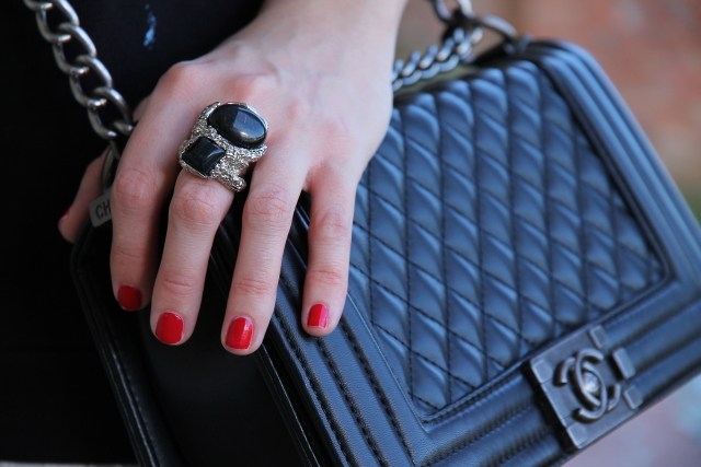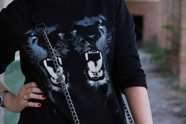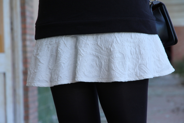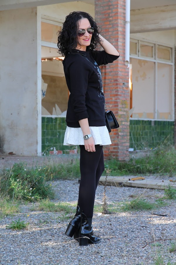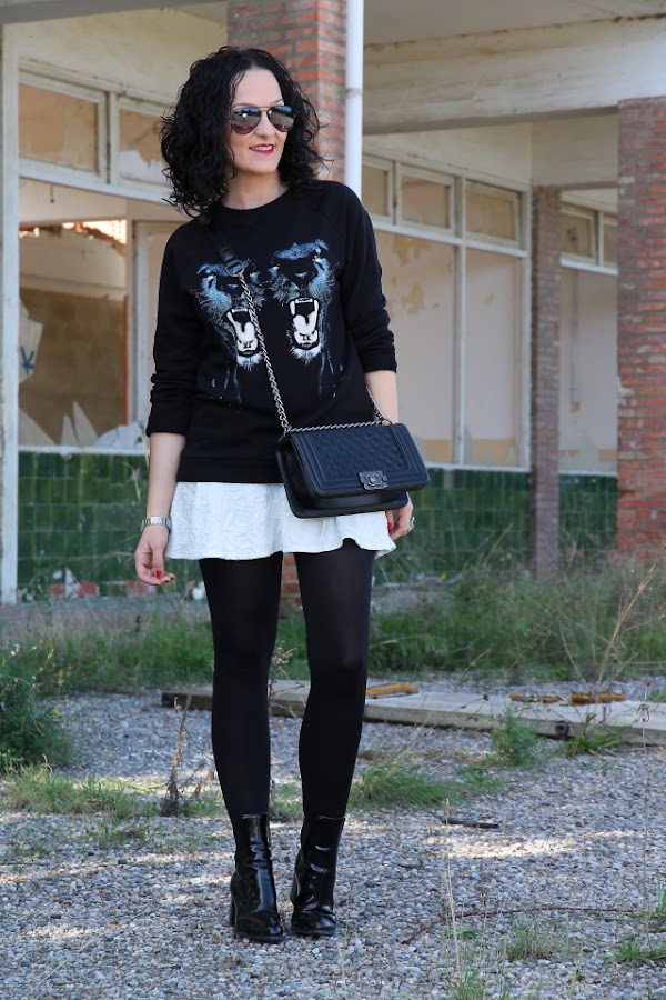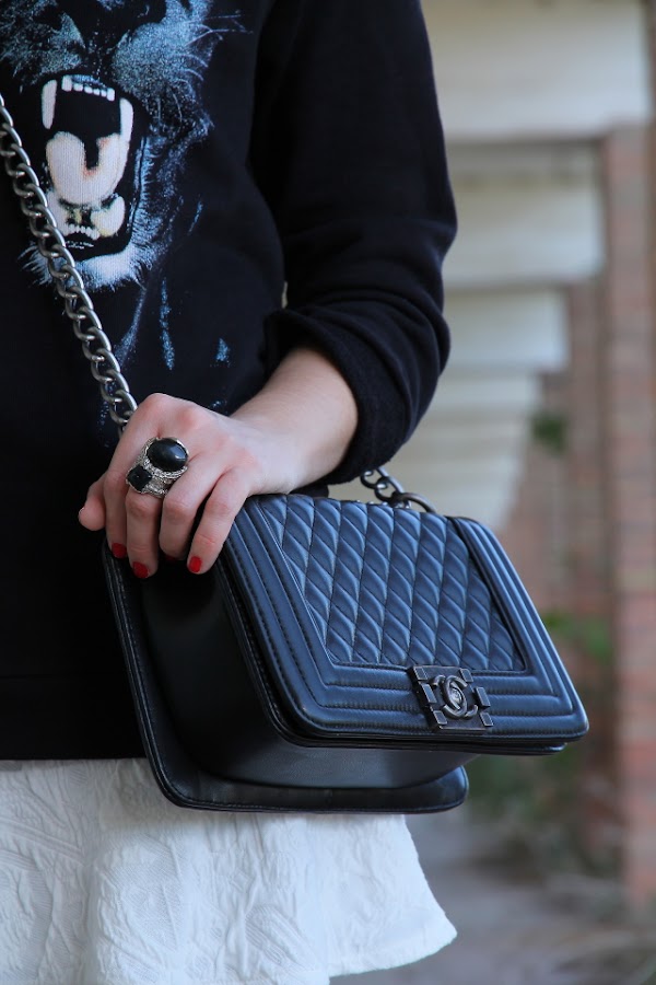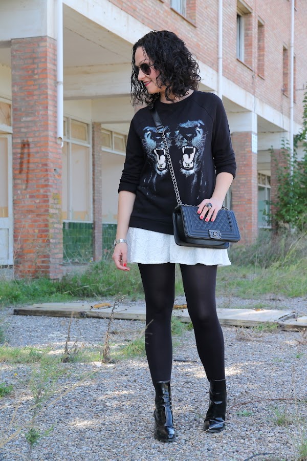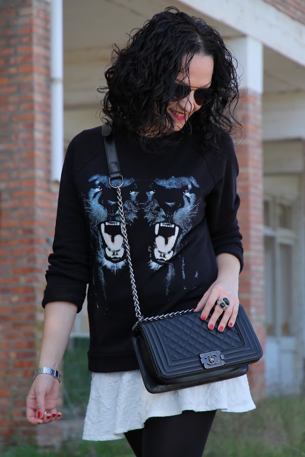 Cuando me compré la sudadera que llevo hoy enseguida pensé en combinarla con esta minifalda blanca. Y si a este combo además le sumamos unos botines cómodos y este bolso estilo Boy de Chanel tenemos un look bastante cañero ideal para salir de marcha con los amigos o irnos de concierto.