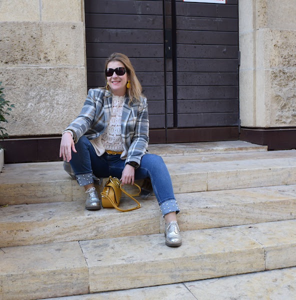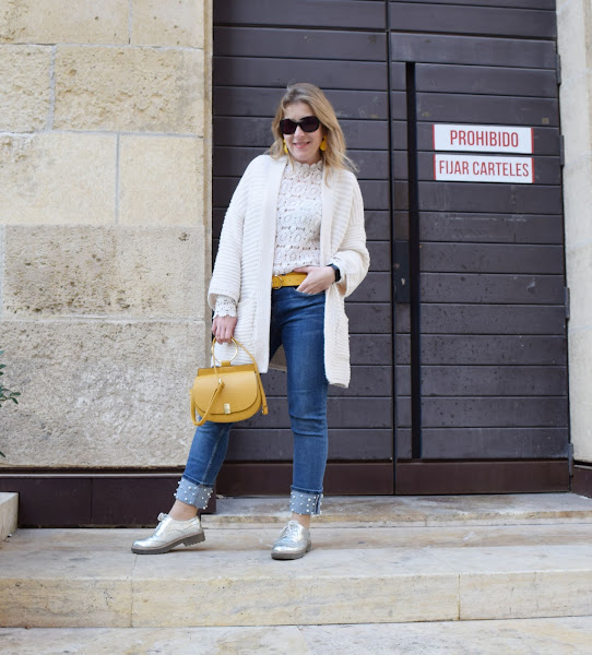 En el look de hoy he incorporado toques mostaza en los complementos: bolos, cinturón y pendientes, como digo compras de rebajas, que por poco añaden ese toque especial a la prendas más básicas.