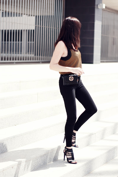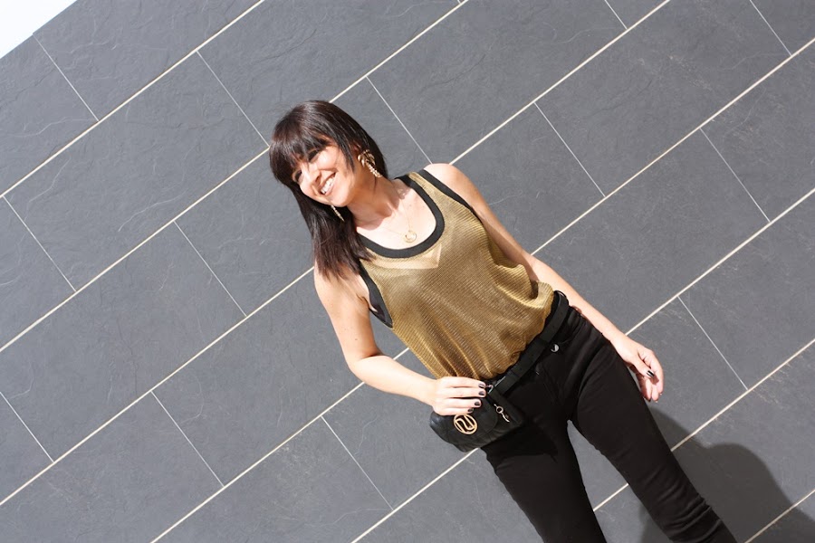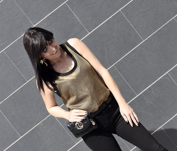 Hoy mi propuesta da ejemplo de ello, un jeans negro y un top semitransparente hacen un look muy atractivo donde la riñonera de vestir se convierte en una gran aliada.
