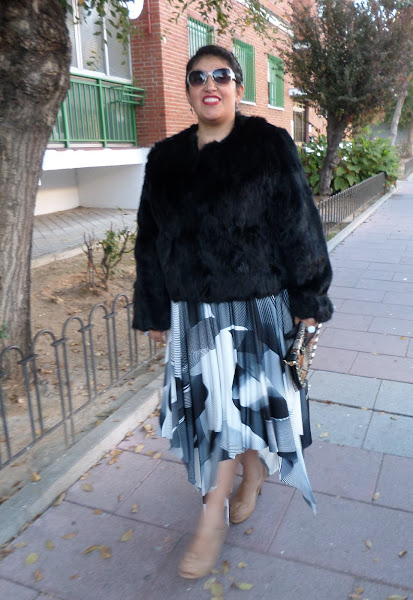 ..... abrigo de pelo negro con bolso en print animal y peep toes en color nude.