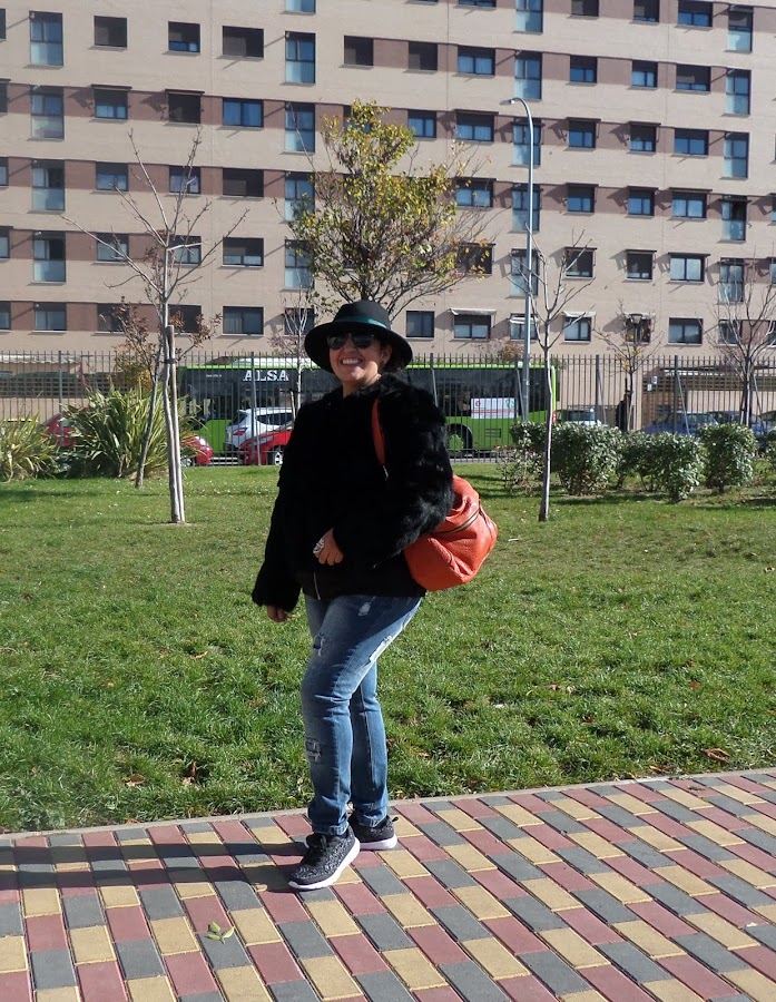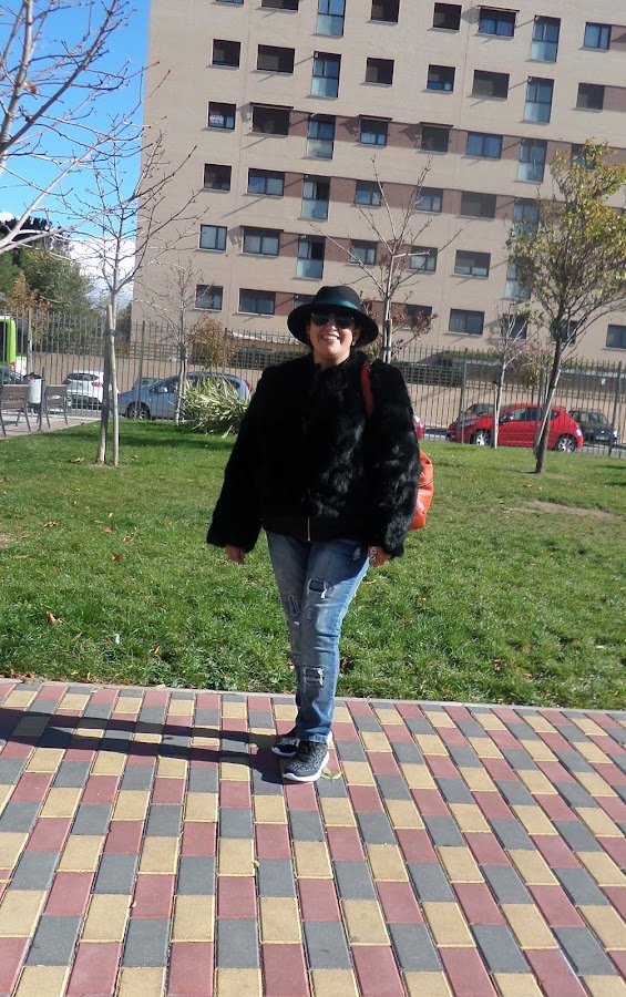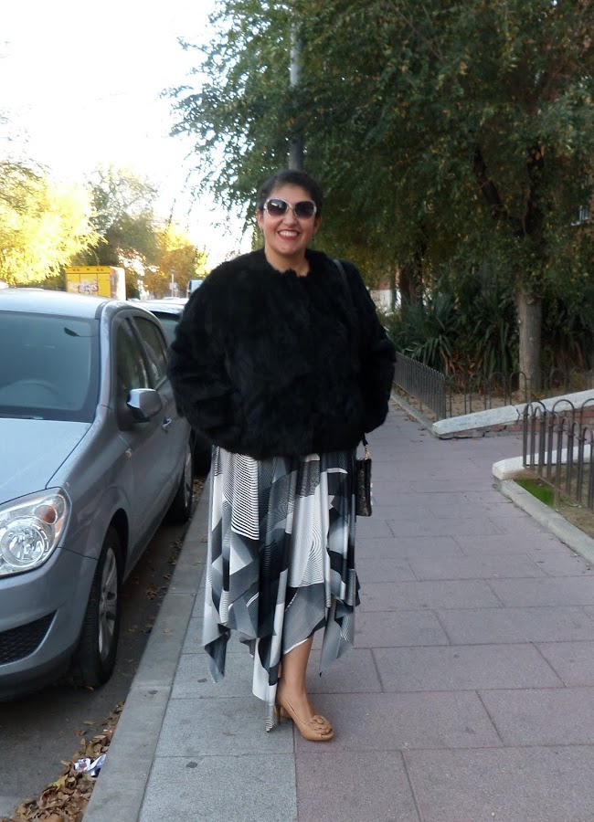 .... abrigo de pelo negro con sombrero, zapatillas y bolso boho