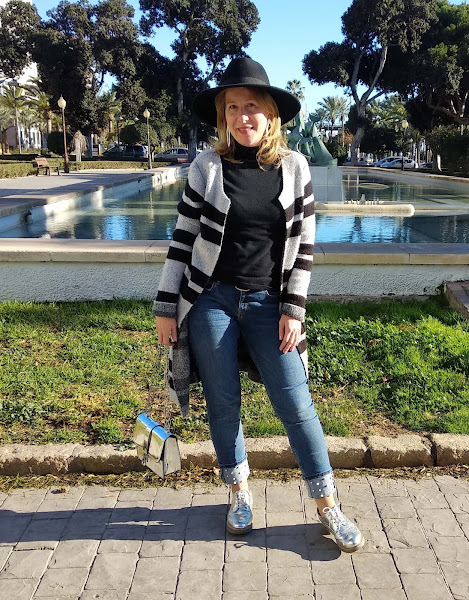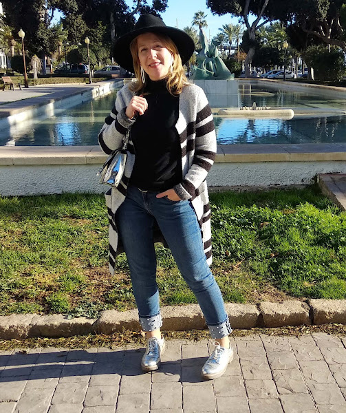 A modo de abrigo, una chaqueta larga en color gris y de rayas, una de las más bonitas de mi armario por su versatilidad y fácil combinación con numerosas prendas de mi armario.